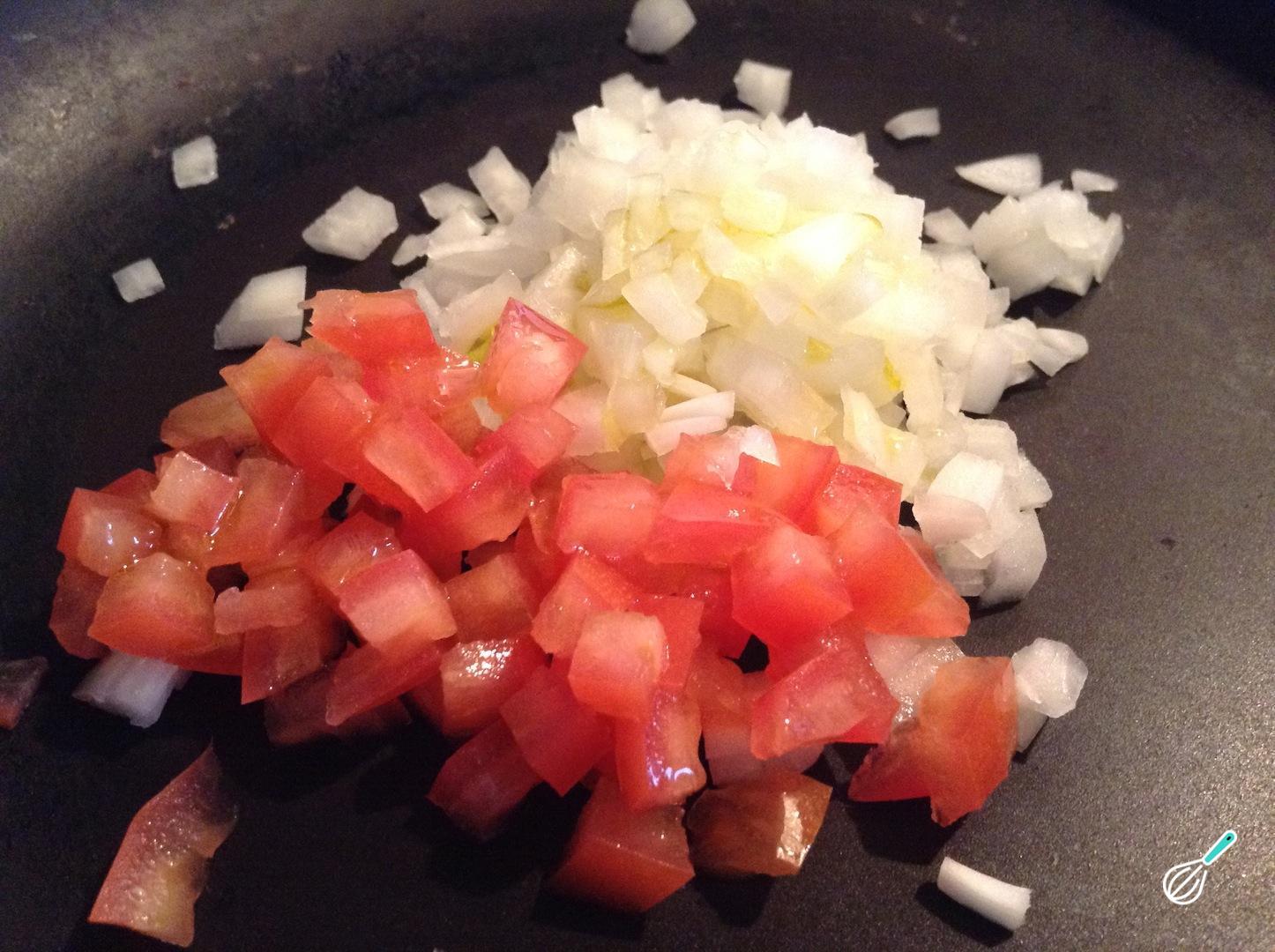 Leve uma frigideira ao fogo médio com um pouco de azeite e refogue a cebola branca e o tomate cortados em cubinhos.