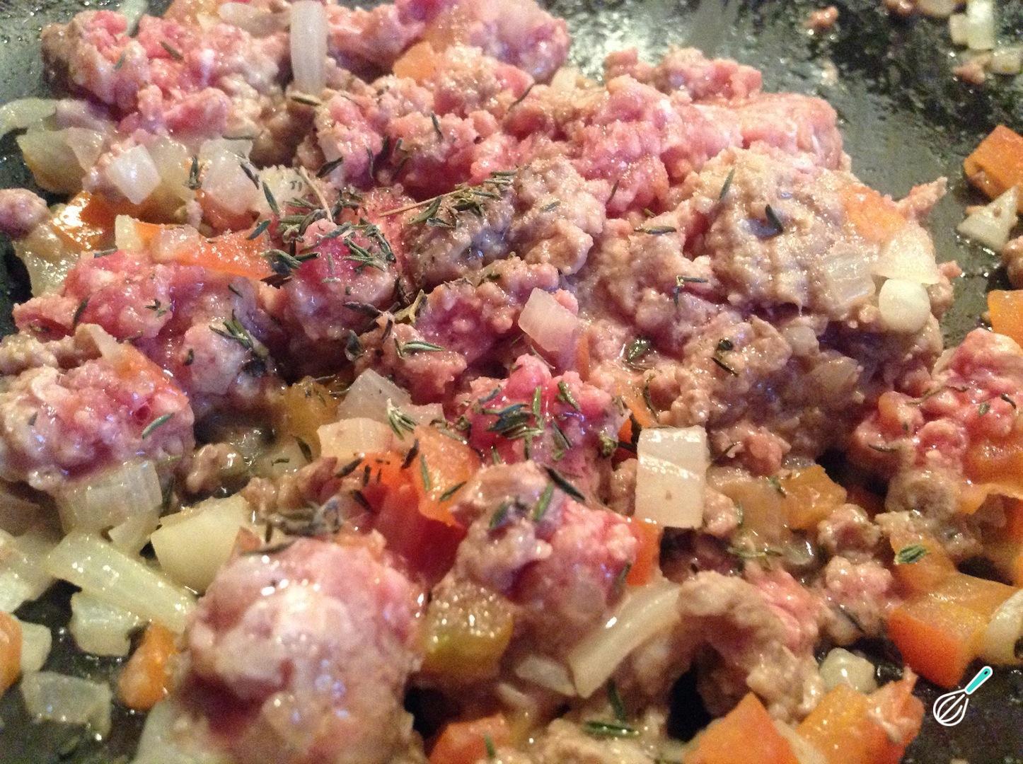 Quando a cebola e o tomate estiverem macios acrescente a carne moída e misture bem. Tempere com sal, pimenta, tomilho e oréganos a gosto e cozinhe até mudar de cor, mexendo de vez em quando.