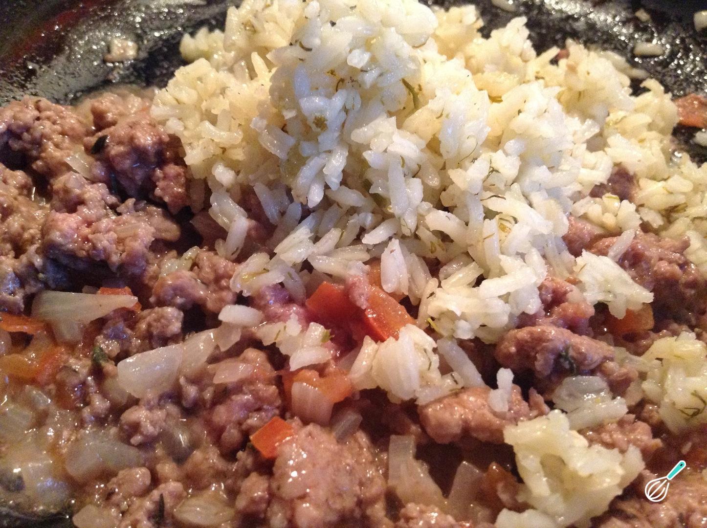 Para terminar de preparar este recheio dos pimentões acrescente o arroz e envolva bem com a carne. Cozinhe por mais 1-2 minutos e desligue o fogo.