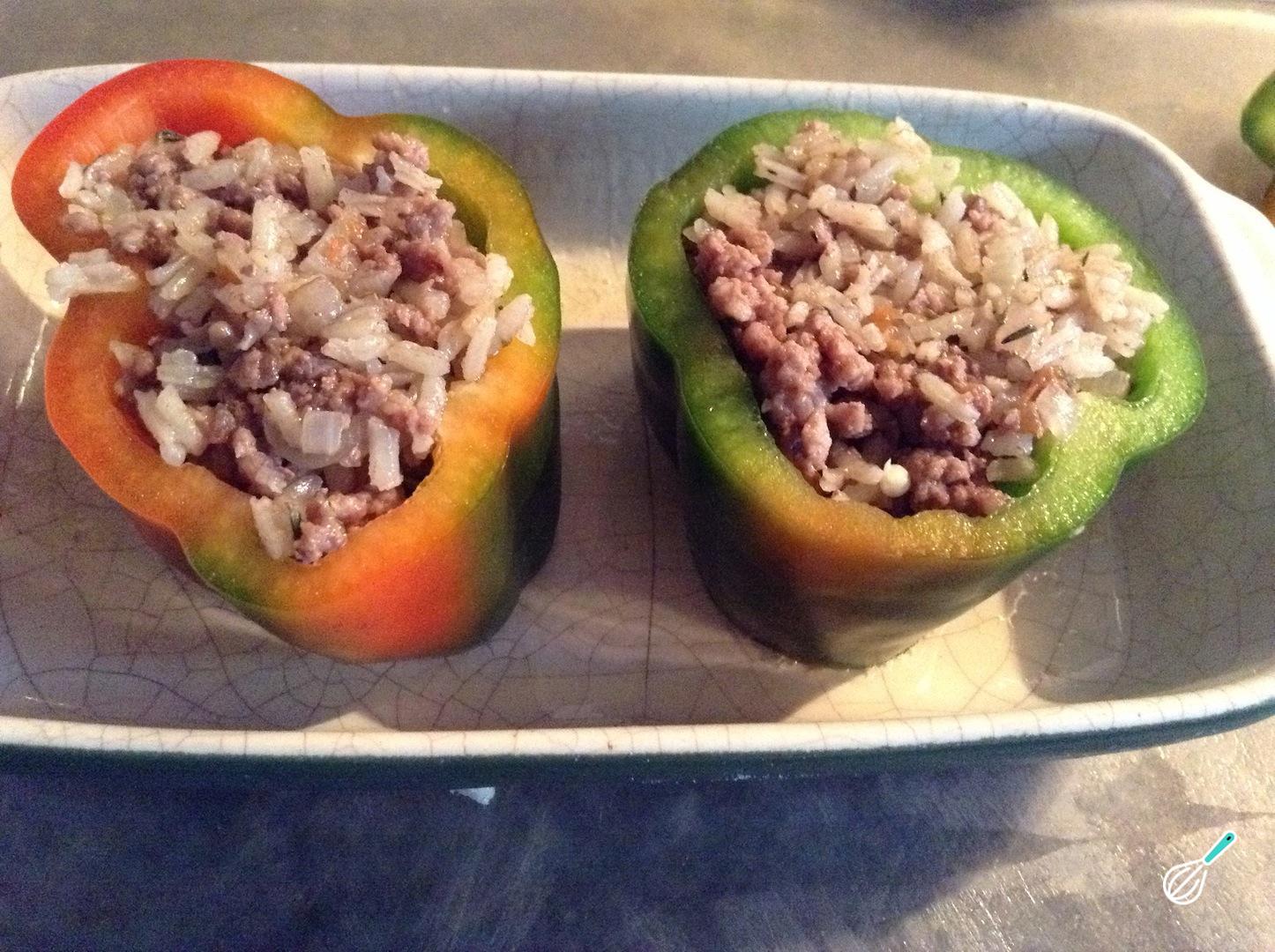 No momento de rechear os pimentões corte o topo e retire as sementes. Coloque em um refratário untado e acrescente a mistura de carne moída e arroz, pressionando bem com uma colher para ficar compacto.