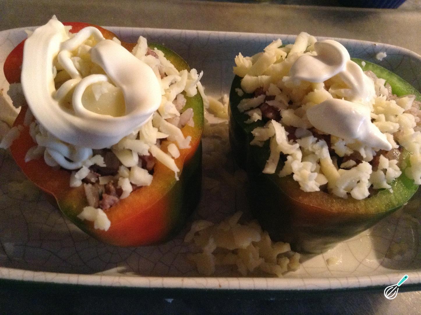 Cubra o recheio com queijo ralado e acrescente um pouco de requeijão. Leve os pimentões a assar no forno a 180ºC por 20-25 minutos aproximadamente, ou até o queijo derreter e gratinar.