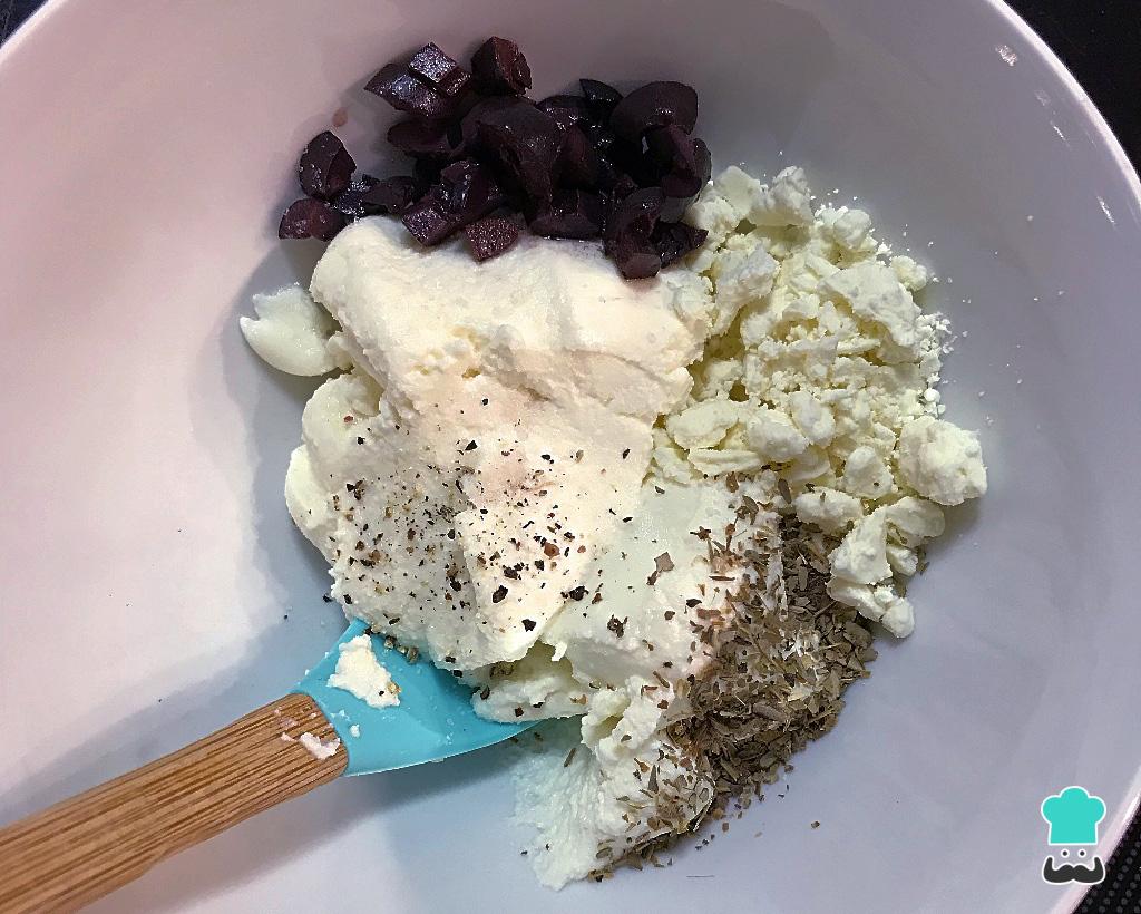 Comece essa delícia pelo recheio: misture a ricota com o queijo de cabra, a azeitona picada, o alho ralado, o sal, a pimenta e as ervas que você escolher (usei mais ou menos ½ colher de sopa de mix de ervas).