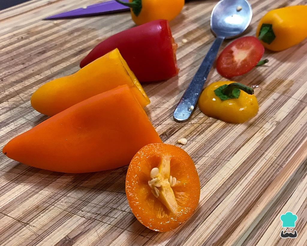 Dica: Neste caso usei pimentões pequenos porque ficam mais bonitinhos para rechear, no entanto você pode preparar esta receita com pimentão de tamanho médio.