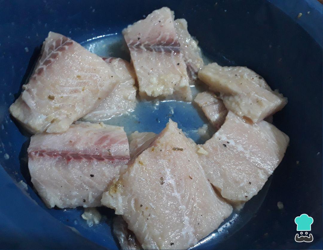 O primeiro passo é temperar os filés de pintado. Para isso coloque o peixe num recipiente e misture com o alho, o suco de meio limão, pimenta e sal e deixe por 15 minutos.
