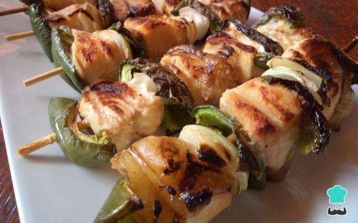 Após o tempo indicado, corte o peixe em cubos e monte os espetos de pintado, se quiser, intercalando com pimentão vermelho, pimentão verde e cebola.