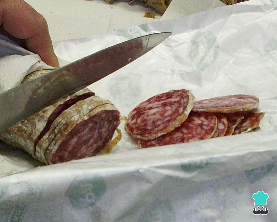 Em seguida corte o salame em fatias fininhas e doure ligeiramente numa frigideira. Faça o mesmo com o pimentão cortado em tiras.