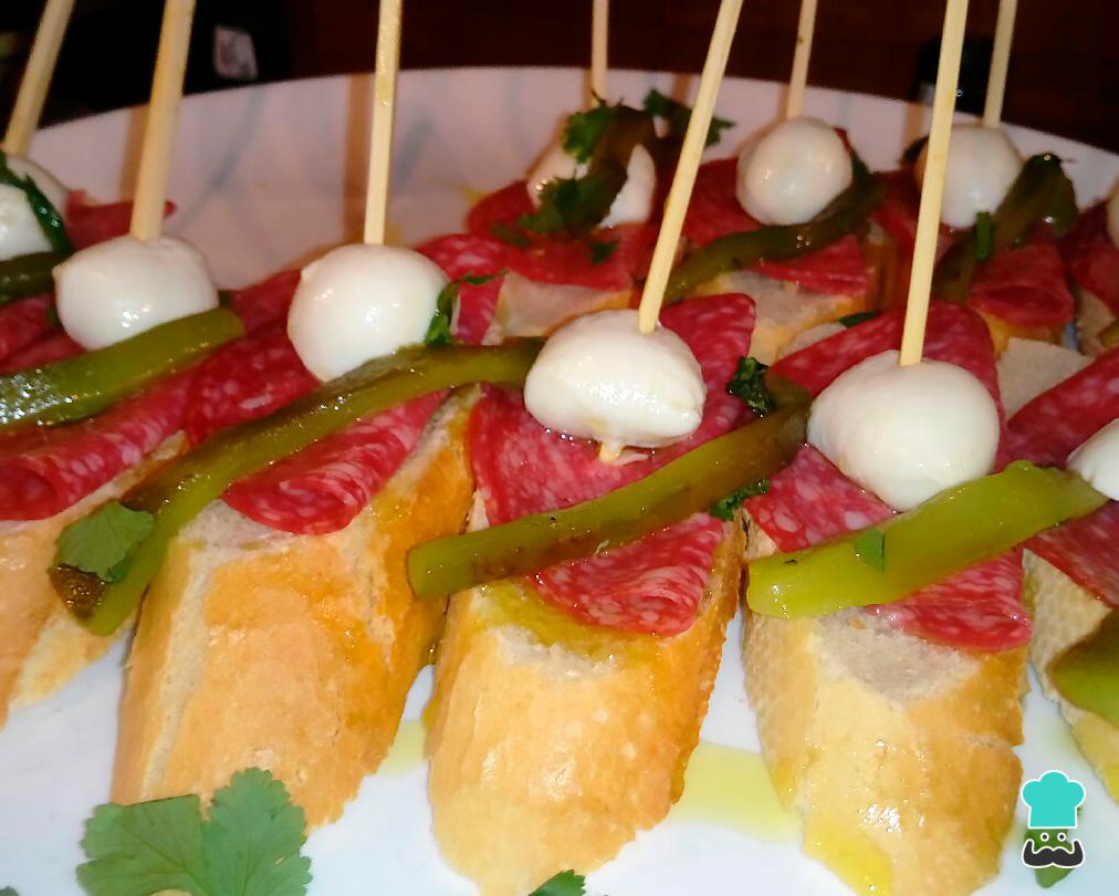 Um pintxo, ou pincho, é um petisco espanhol que consiste em vários ingredientes sobrepostos numa fatia de pão e presos com um palito. Esse quitute é bem comum nos botecos espanhóis e podem ser doces ou salgados, preparados com uma infinidade de ingredientes. No TudoReceitas compartilho com você esta receita de pintxo espanhol fácil com salame tipo italiano, mussarela de búfala e pimentão verde. Prepare para uma festa e tenho a certeza que será um sucesso!