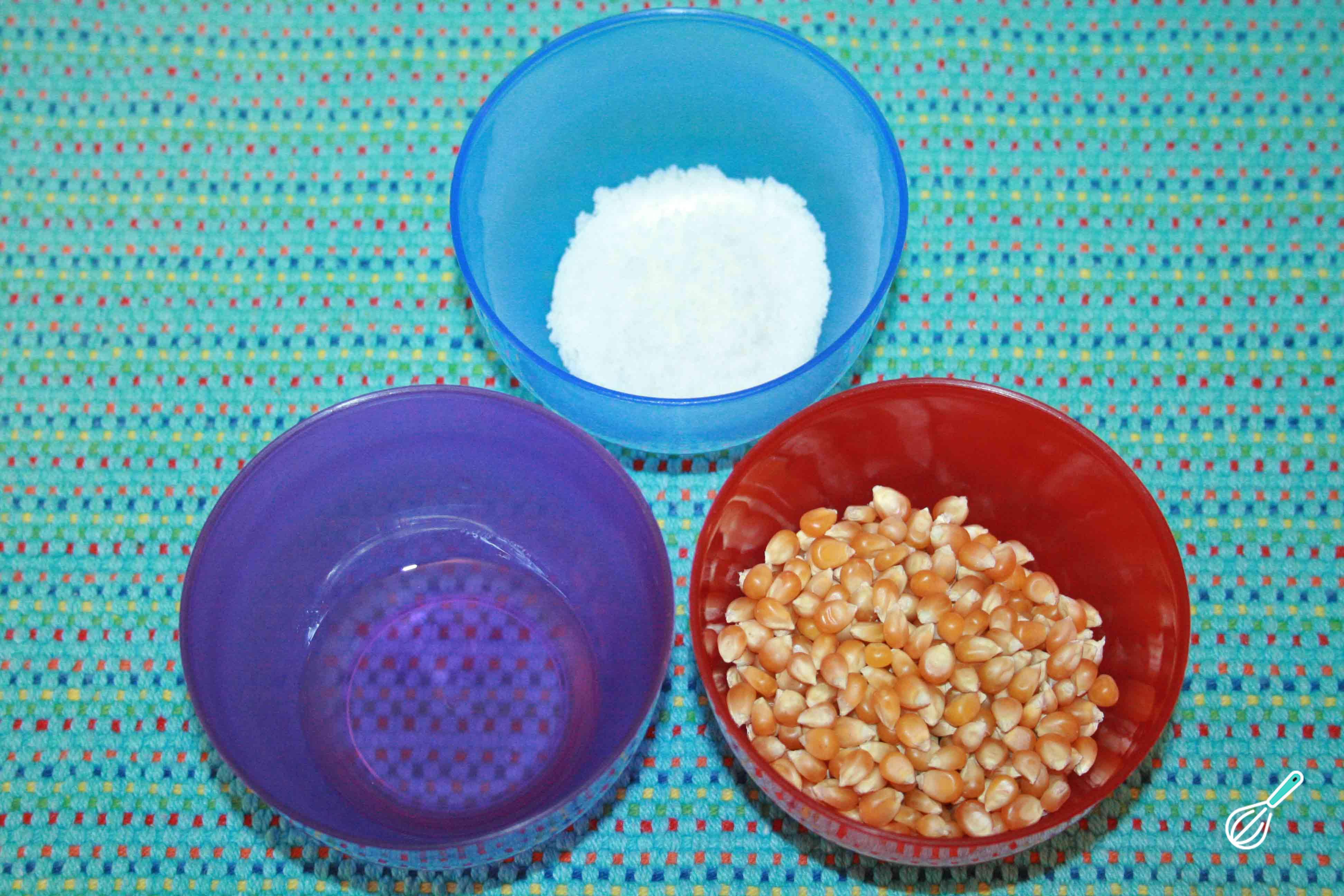 Comece por reunir os ingredientes necessários ao preparo desta receita de pipocas caseiras. Neste caso estaremos preparando pipocas salgadas, se você quiser preparar pipocas doces confira a receita de pipoca doce caramelada.