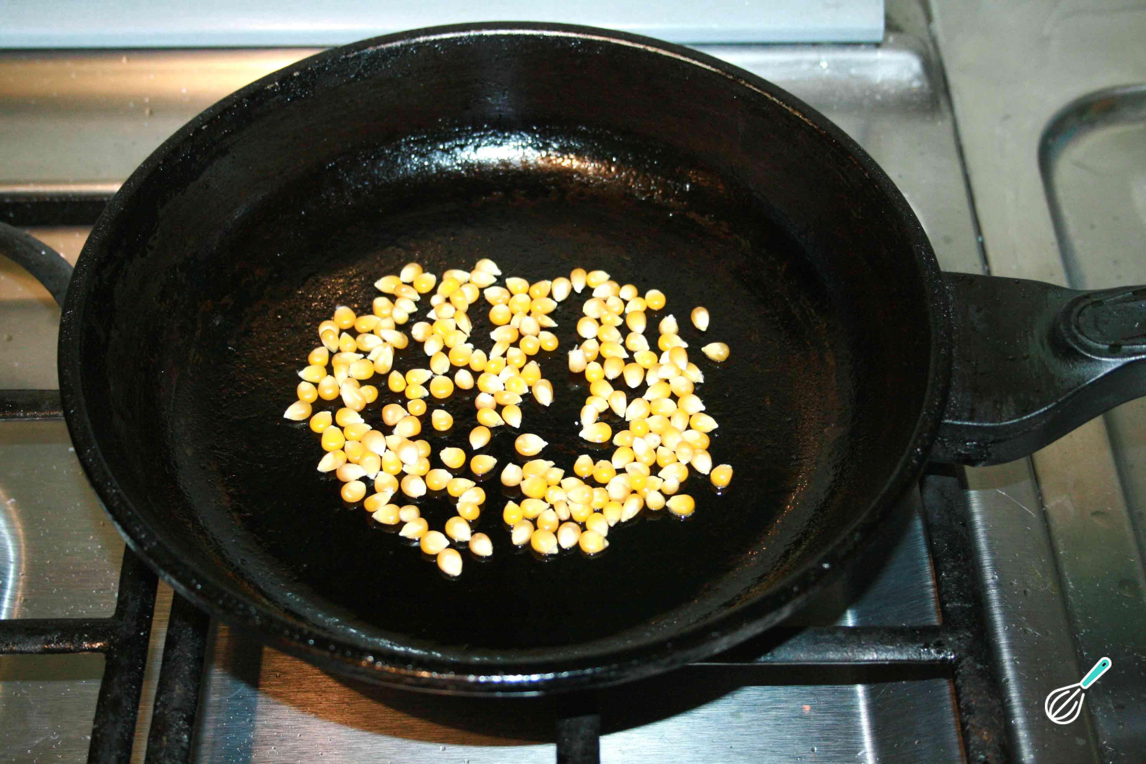 Adicione o milho de forma a que os grãos não fiquem sobrepostos. Tampe deixando uma pequena abertura para que o vapor escape.