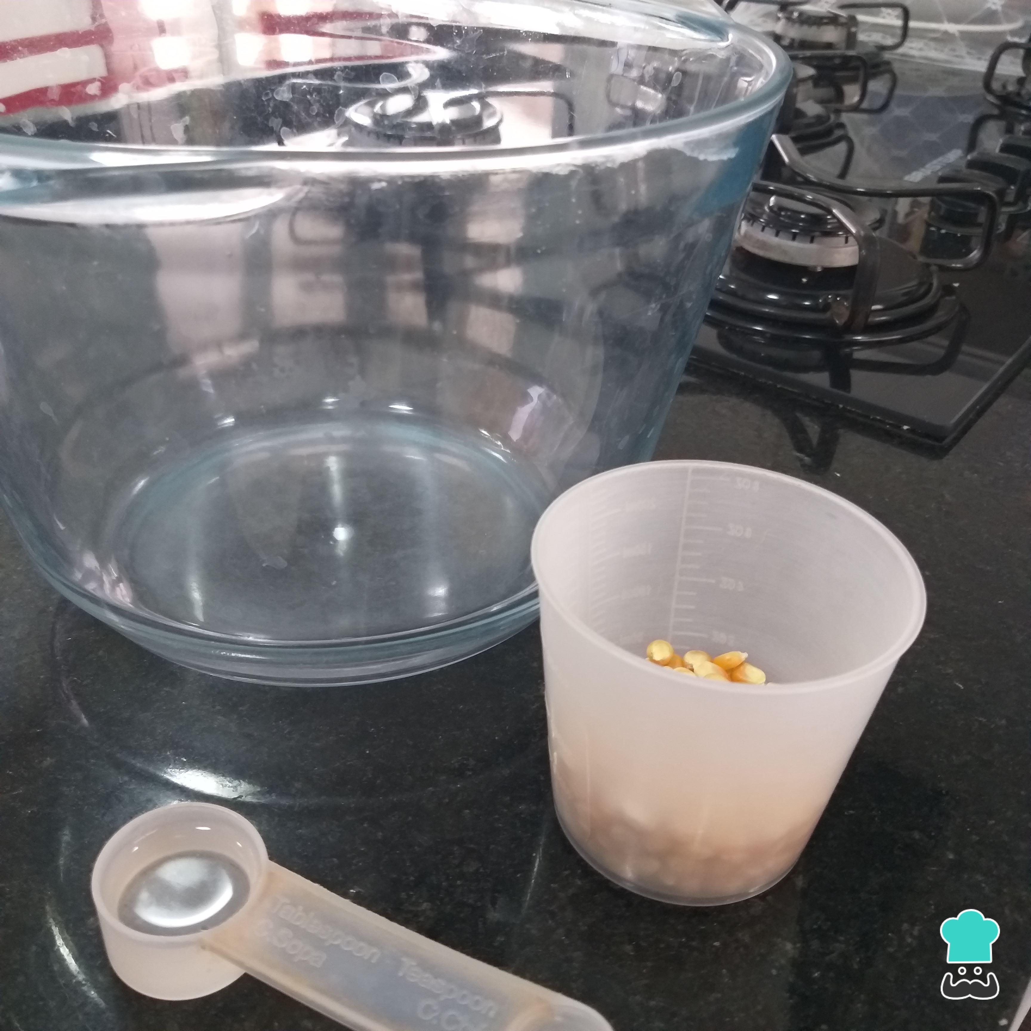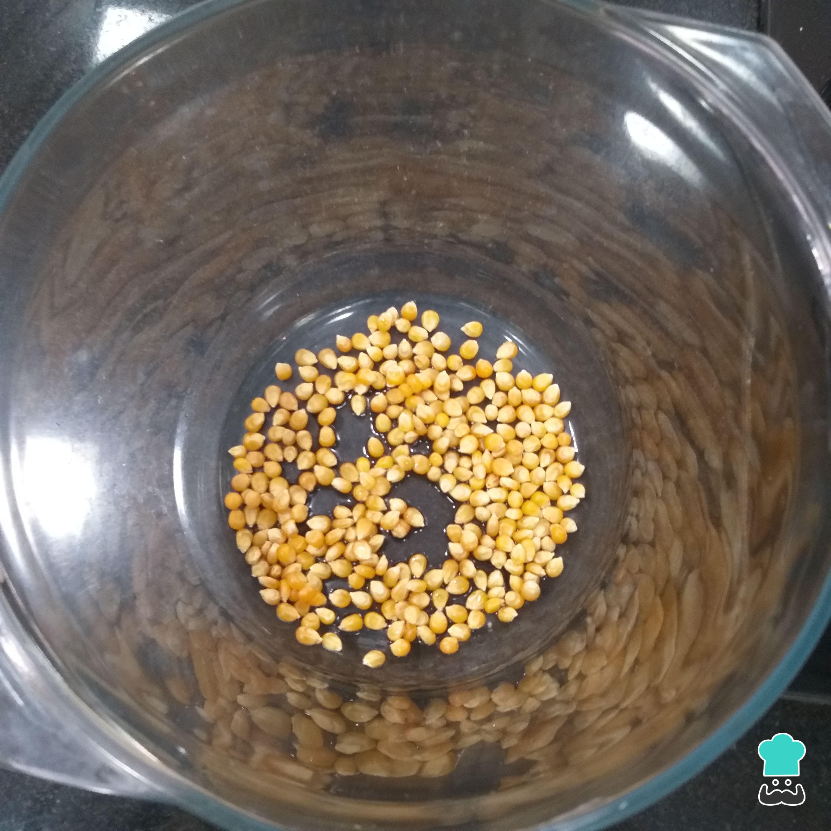 Coloque o milho e a água na vasilha e misture bem. Esta é uma receita de pipoca sem óleo, por isso o resultado será uma pipoca saudável válida para toda a família!
