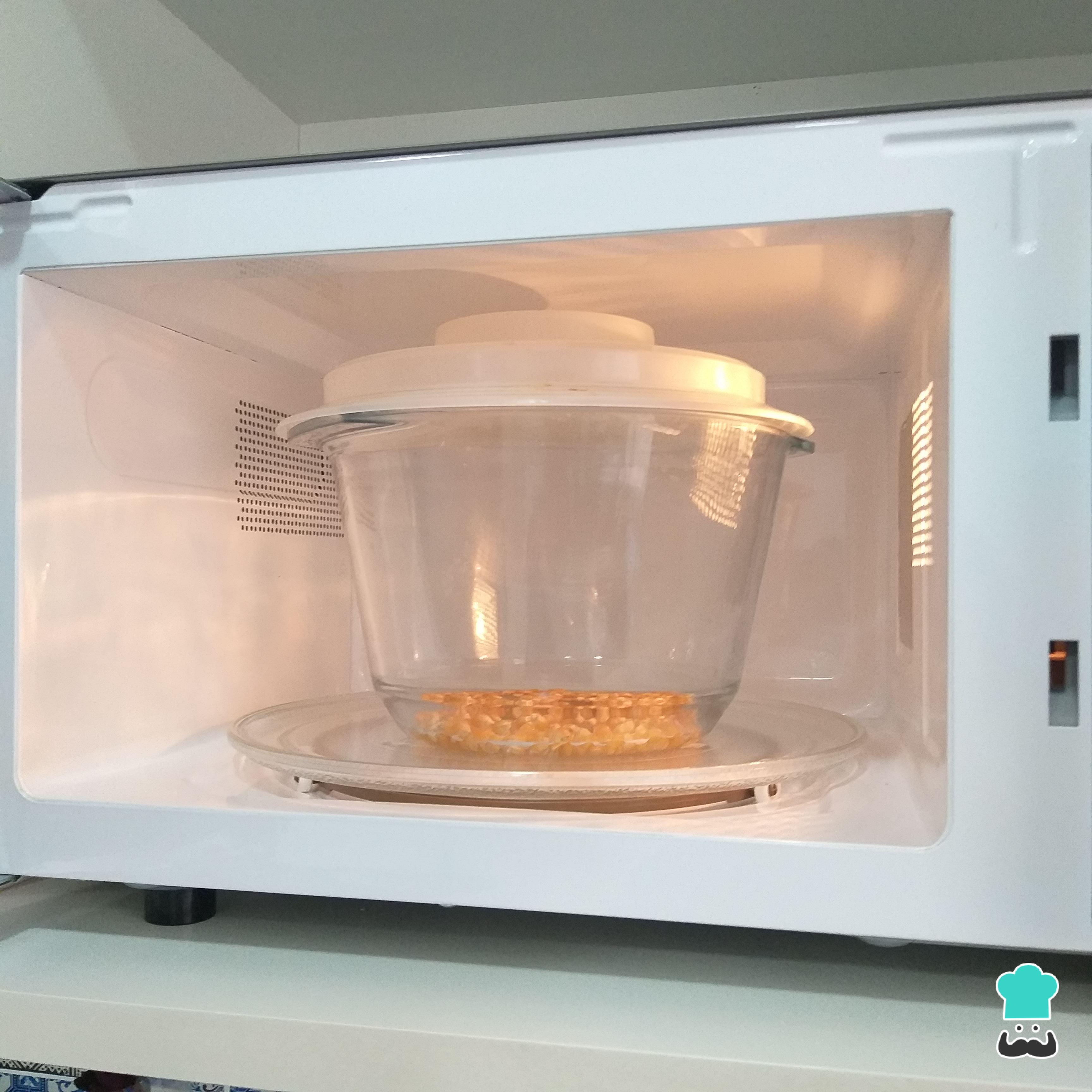 Coloque uma tampa plástica própria para microondas sobre a vasilha e programe o aparelho para 5 minutos em potência máxima, lembrando que o tempo de cozimento pode variar.