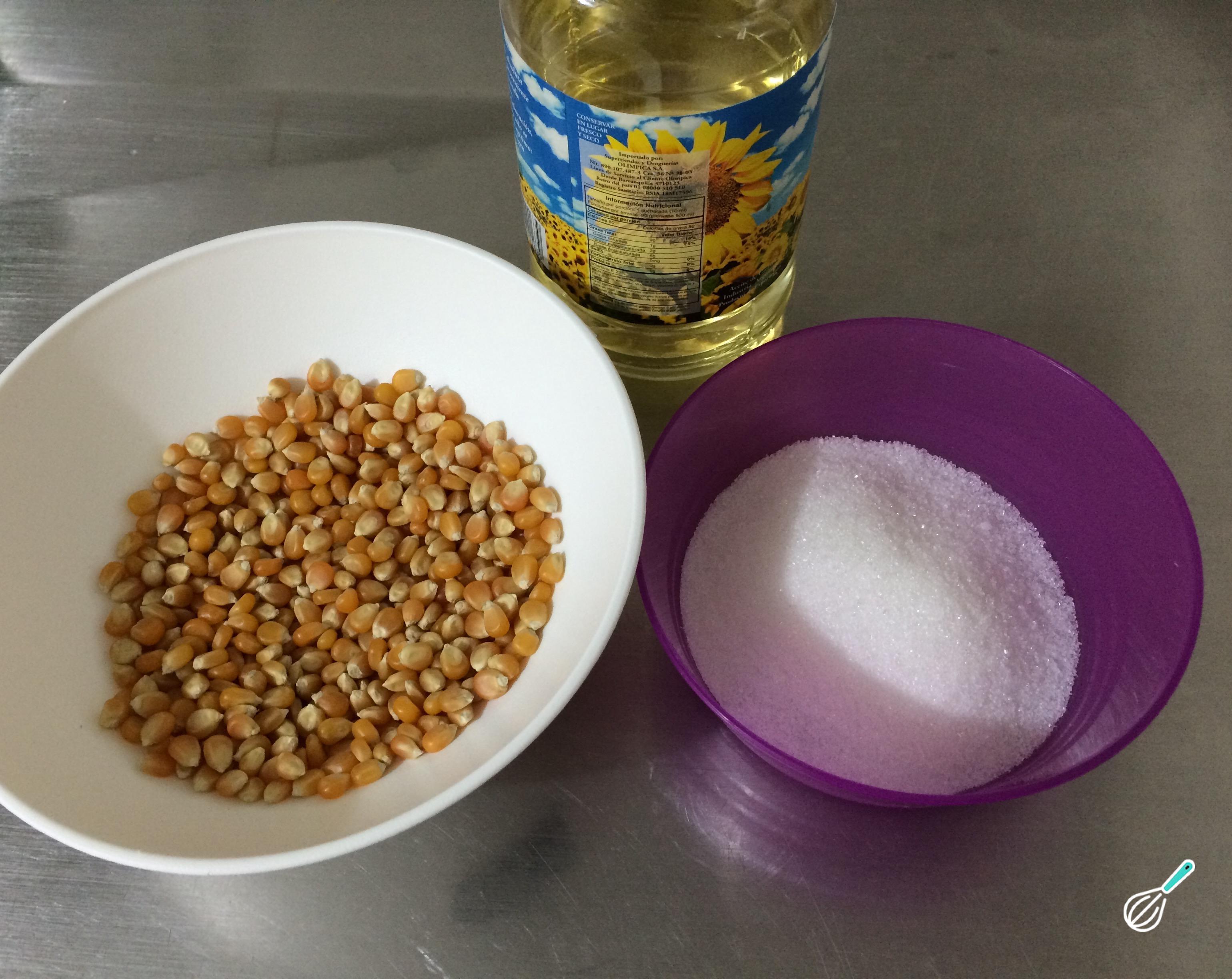 Para fazer esta receita de pipocas carameladas, o primeiro passo é preparar todos os ingredientes.