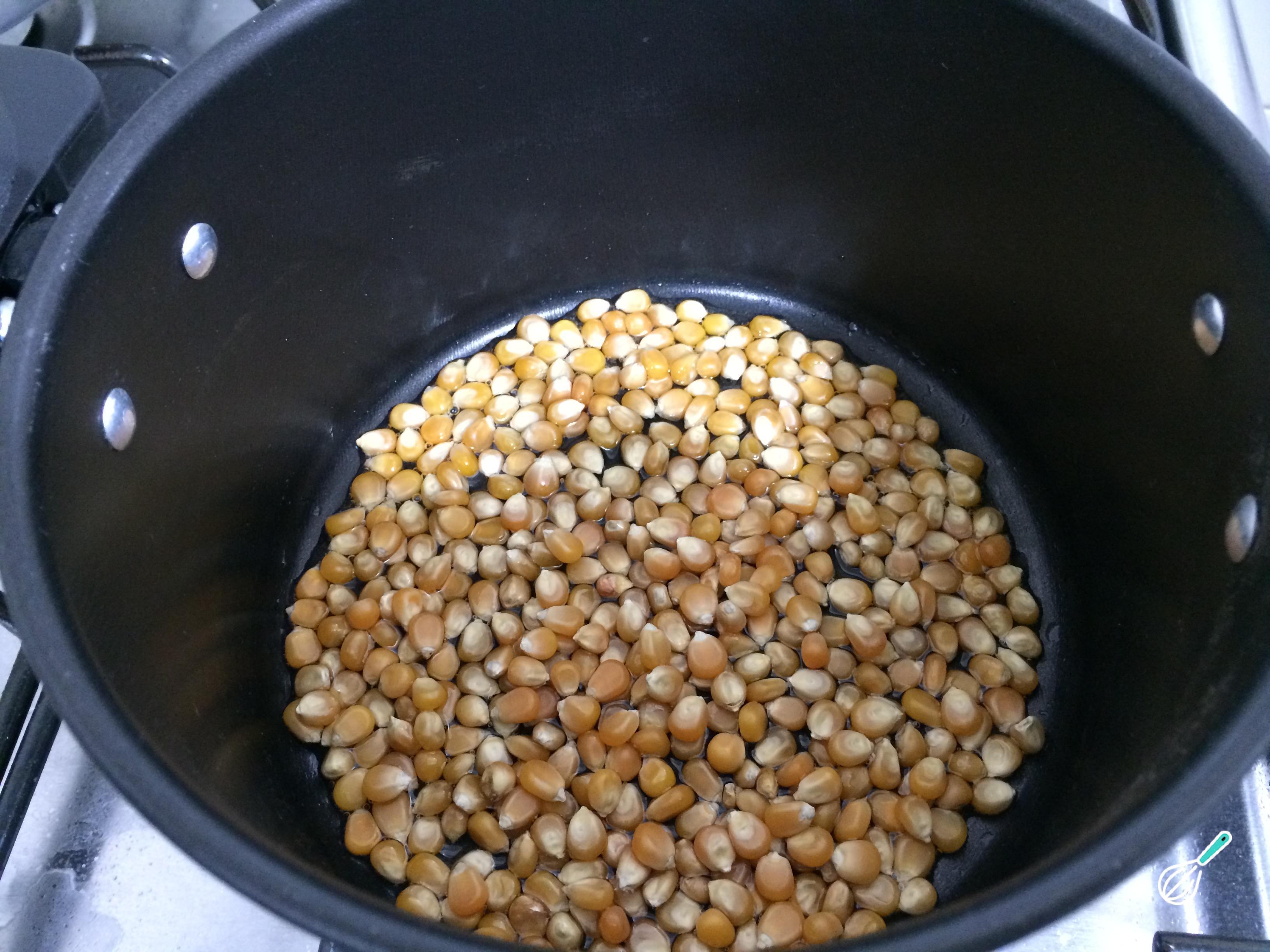 Em uma panela adicione o óleo e o milho. Cozinhe tampado em fogo baixo, até que o milho comece estourando.