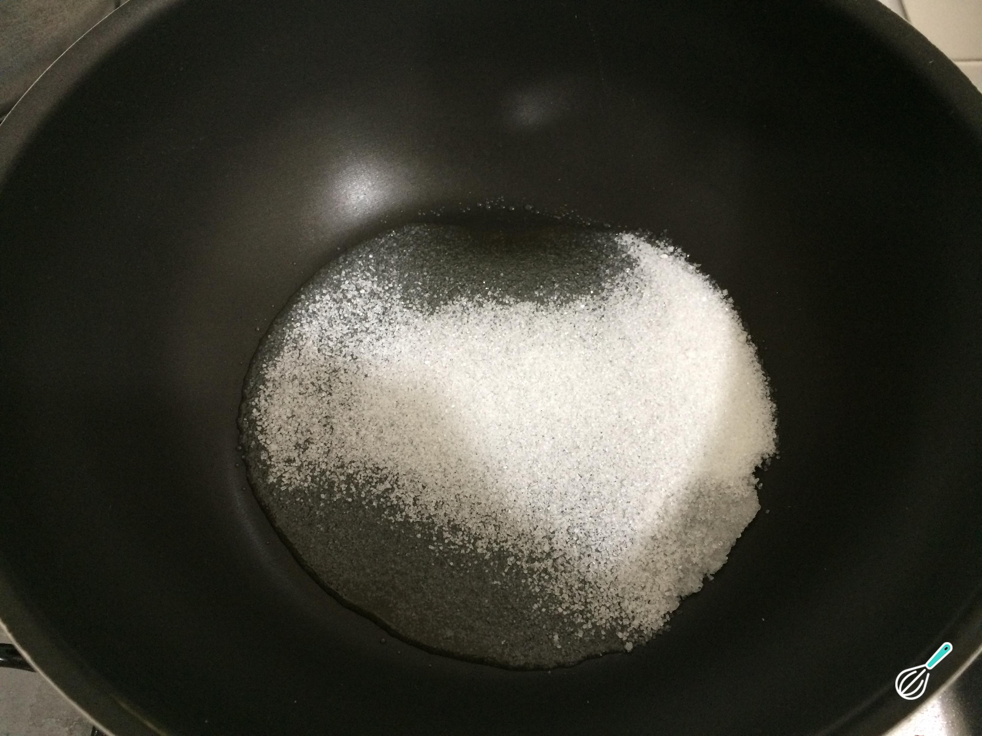 Para fazer o caramelo das pipocas, noutra panela à parte coloque o açúcar e deixe derreter em fogo muito baixo, sem mexer.