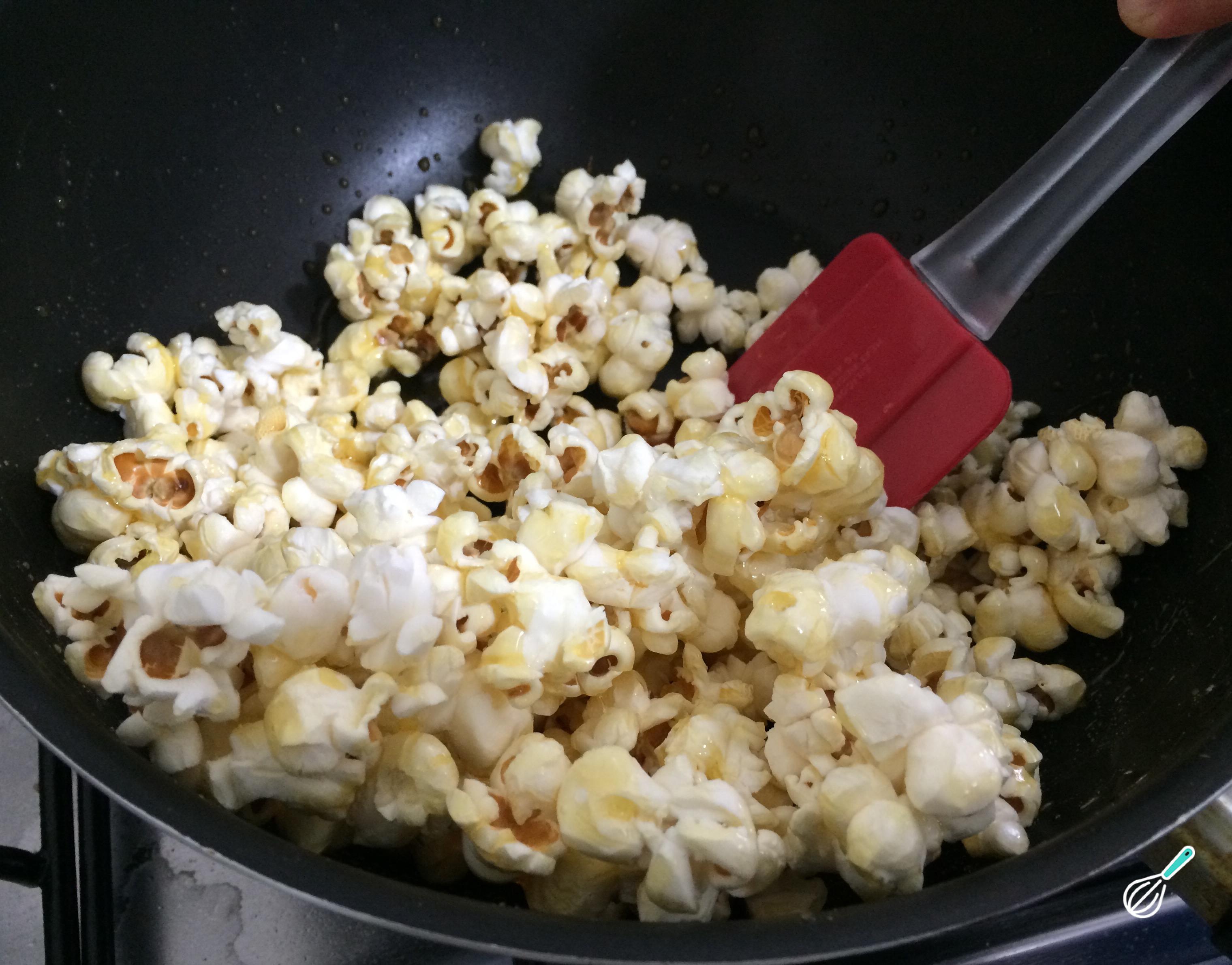 Antes do açúcar escurecer, adicione as pipocas e misture. O ideal é que cada pipoca receba uma camada fina de caramelo.
