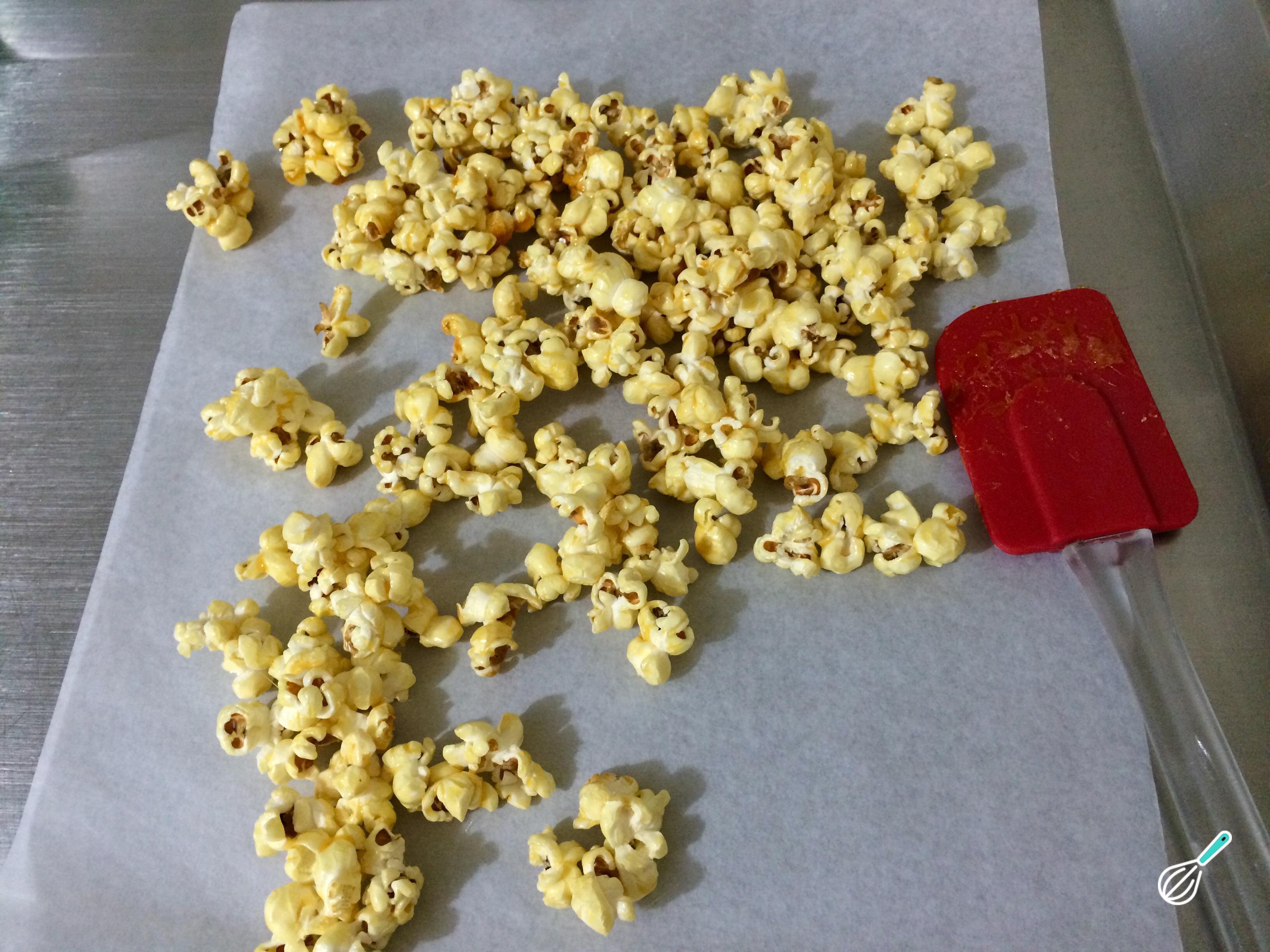 Seguidamente espalhe as pipocas sobre uma folha de papel manteiga e deixe esfriar, para que o caramelo endureça.