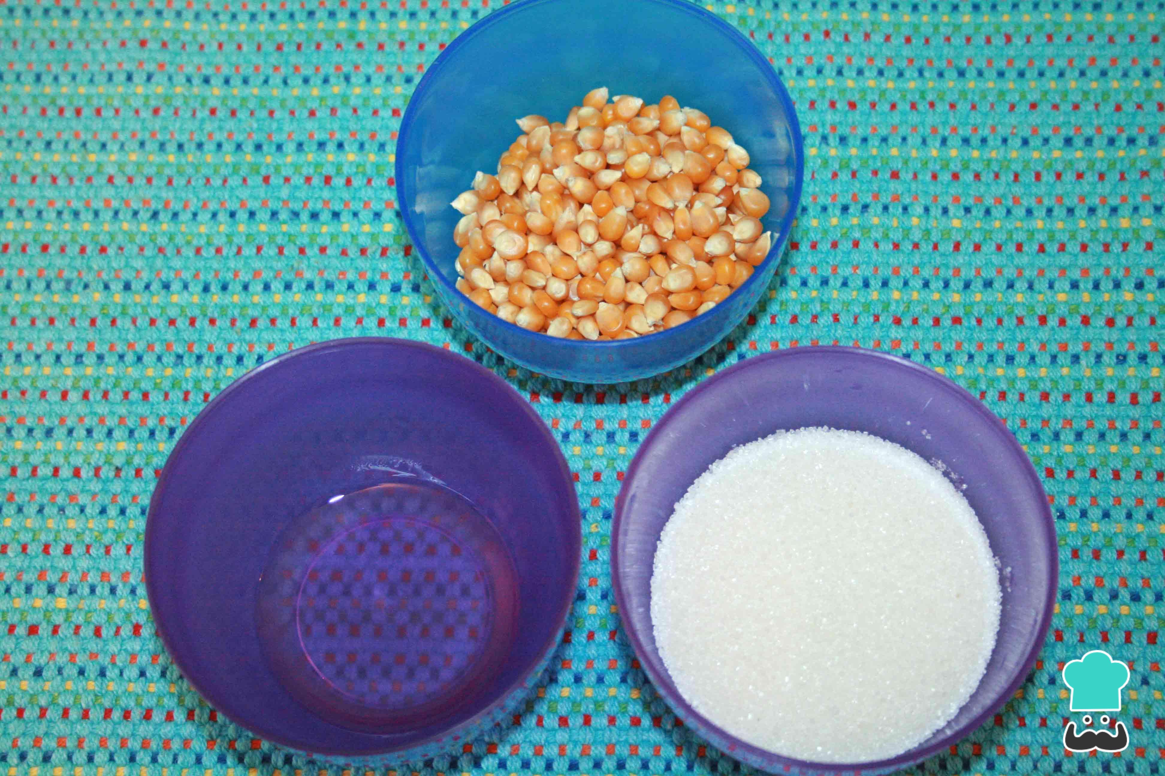 Comece por reunir os ingredientes desta receita de pipoca doce com açúcar.