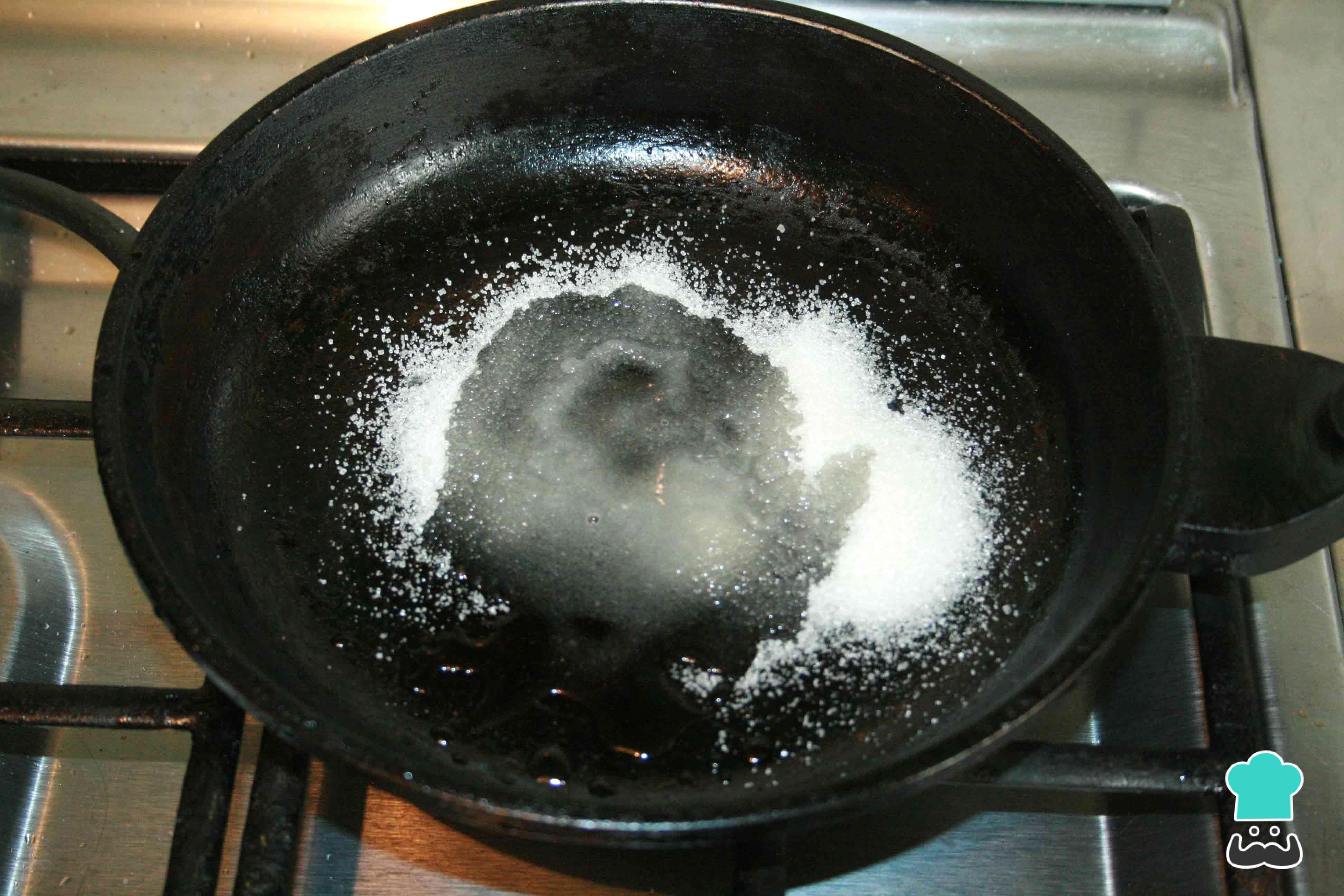 Para terminar de preparar a pipoca de frigideira, coloque o açúcar na frigideira onde fritou as pipocas e junte 2 ou 3 colheres de sopa de água. Deixe no fogo alto até o açúcar derreter e virar um caramelo.