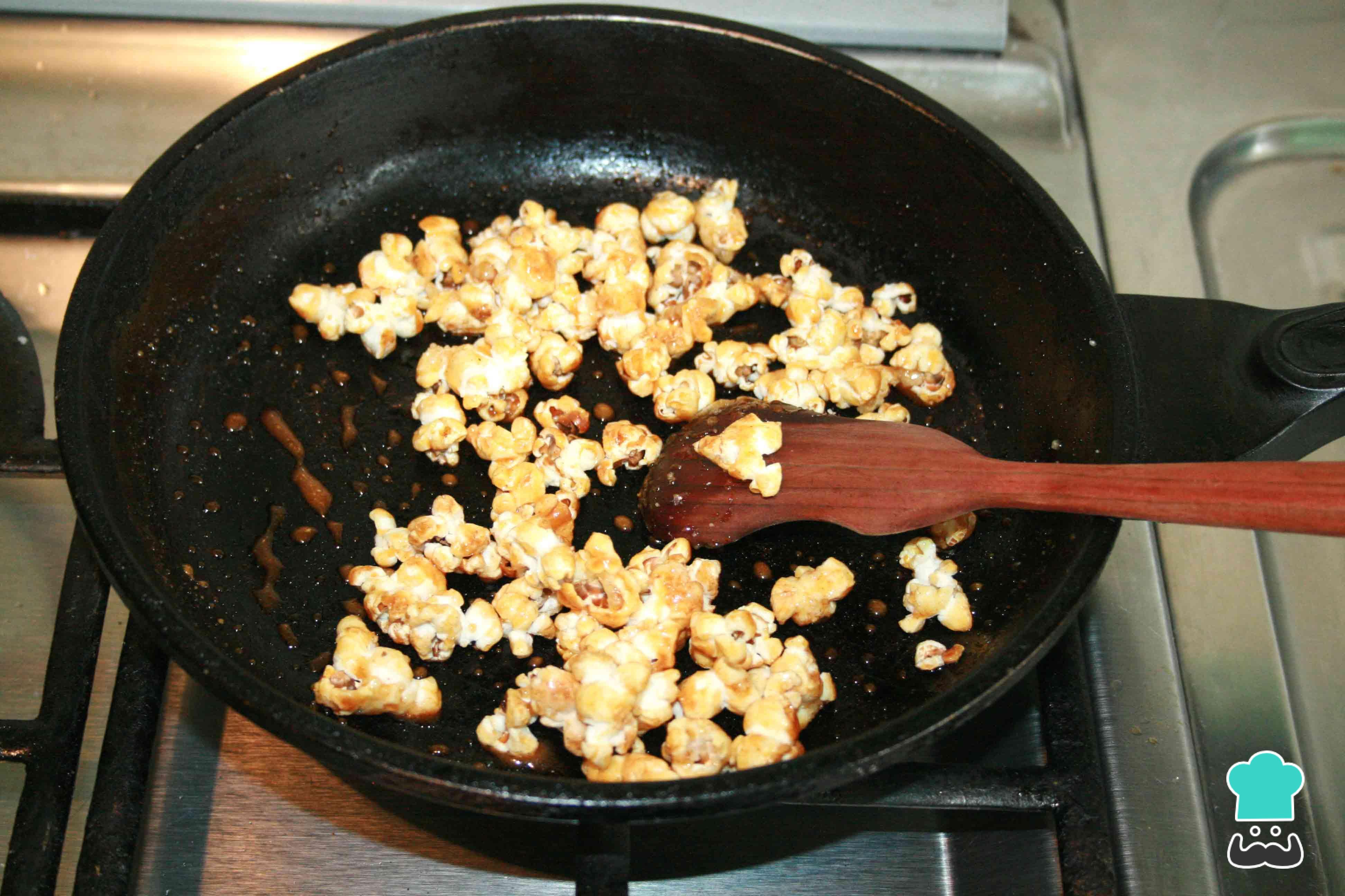 Finalmente, quando o caramelo começar borbulhando, coloque as pipocas doces e misture. No início pode parecer que o açúcar está cristalizando, no entanto continue mexendo até as pipocas ficarem carameladas.