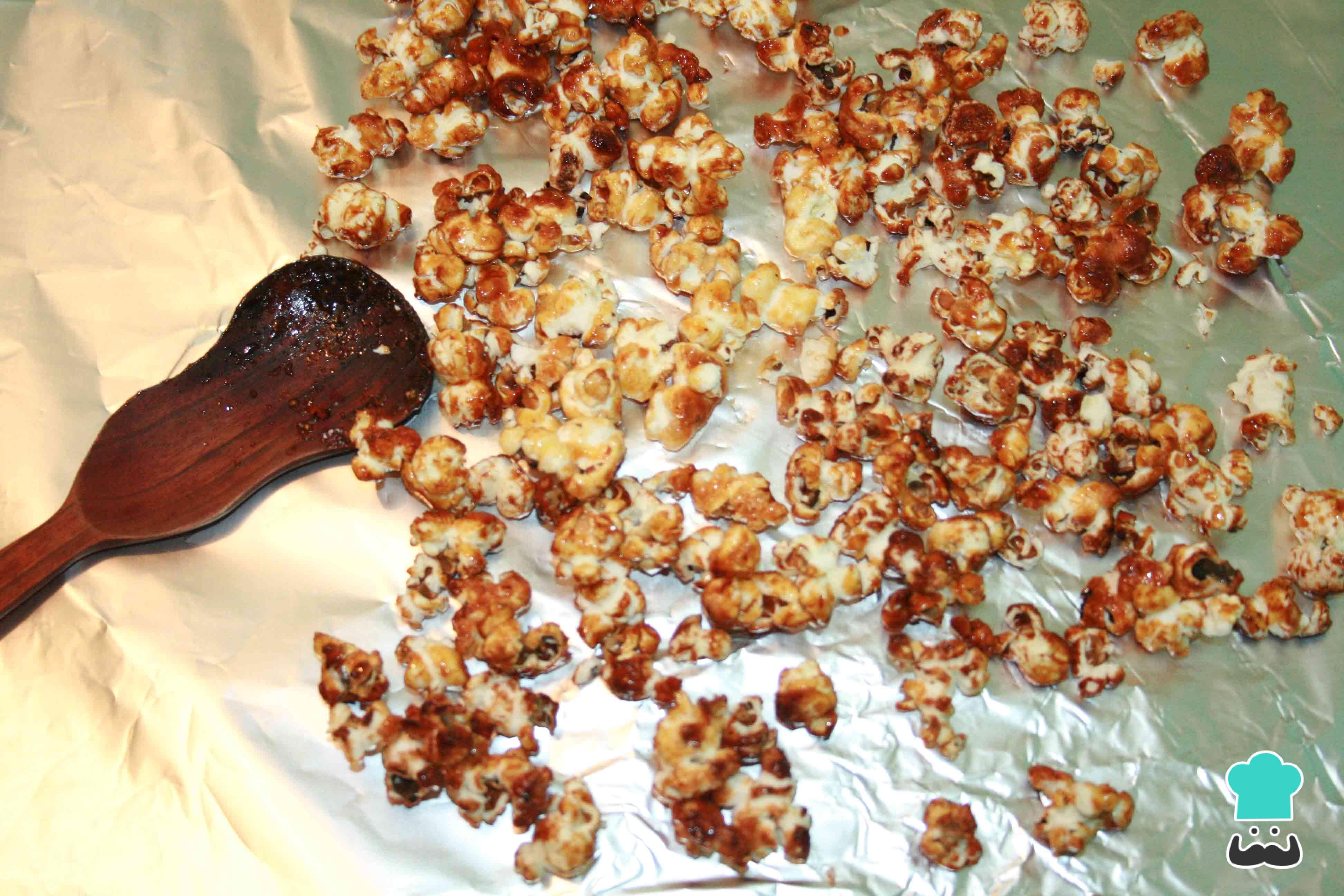 Coloque as pipocas sobre papel alumínio, espalhe bem e deixe ficar até o caramelo endurecer.