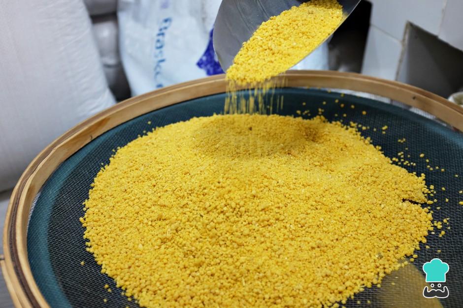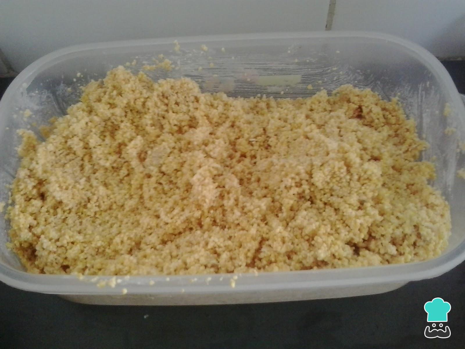 Enquanto isso, coloque a farinha e 200ml de leite de coco em uma tigela, e reserve para hidratar a farinha (não precisa cozinhar, é só hidratar, tal como cuscuz marroquino).