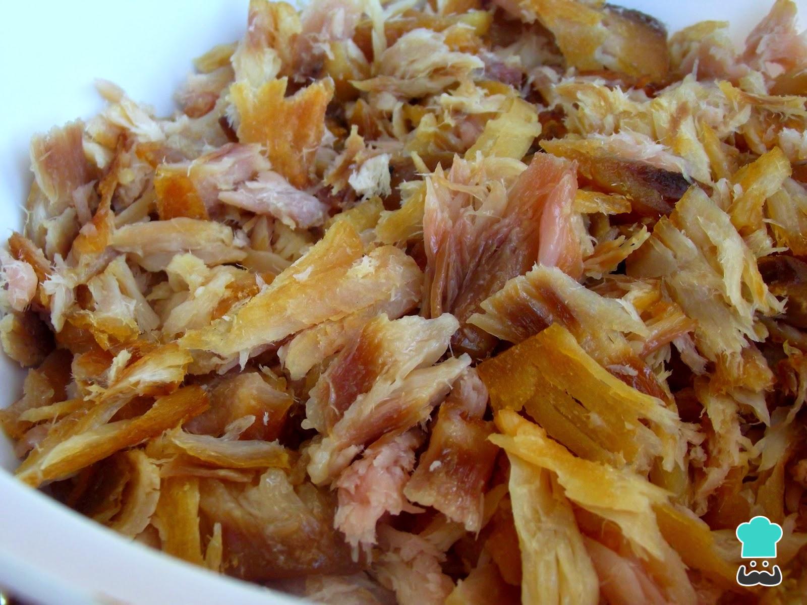 O primeiro passo é cozinhar o peixe: coloque o pirarucu dessalgado em uma assadeira untada, cubra com um pouco de azeite, e asse por 20-30 minutos no forno preaquecido a 200ºC. Depois retire, deixe esfriar um pouco e desfie em lascas.