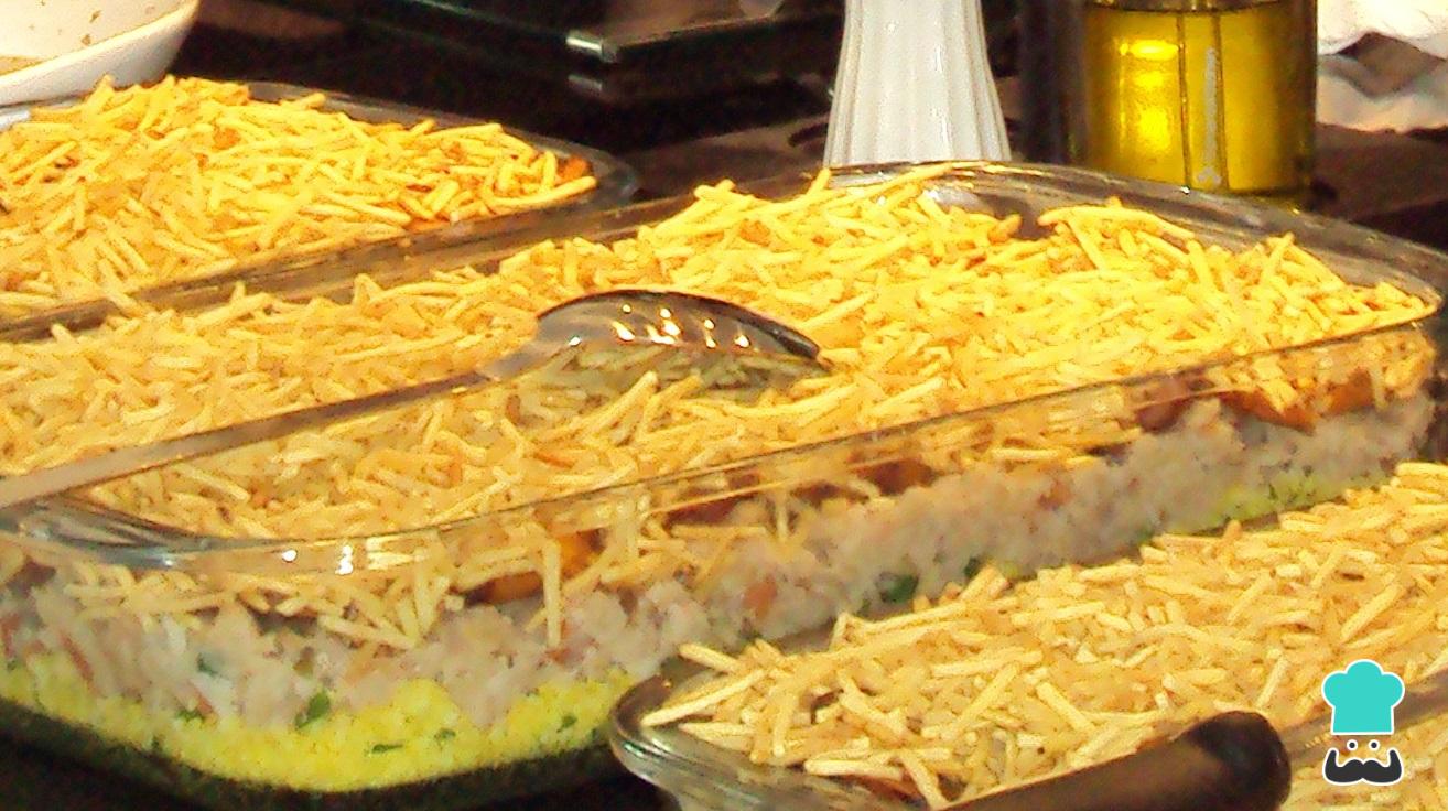 Para terminar, monte o pirarucu em uma assadeira, alternando camadas de farofa de pirarucu com fatias de banana e ovos cozidos em rodelas, e terminando com batata palha e ovos. Se preferir, também pode colocar os ingredientes separados na assadeira.