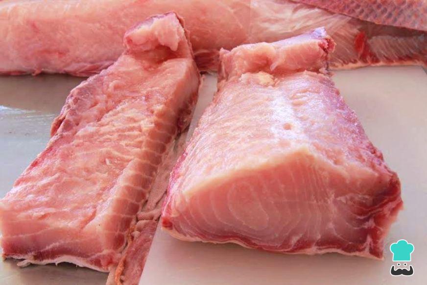 O primeiro passo dessa receita de pirarucu é temperar o peixe com sal e pimenta.