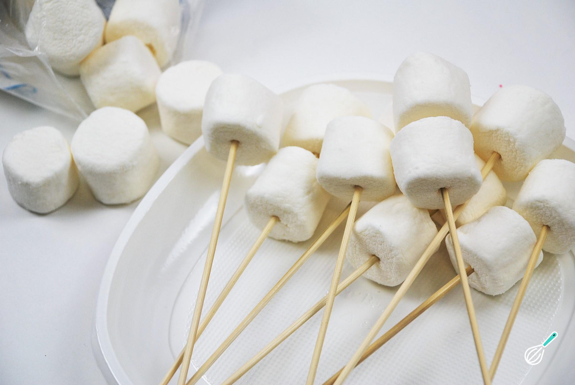 A primeira coisa que você deve fazer para preparar estes marshmallows decorados é inserir um palito de espeto em cada um.