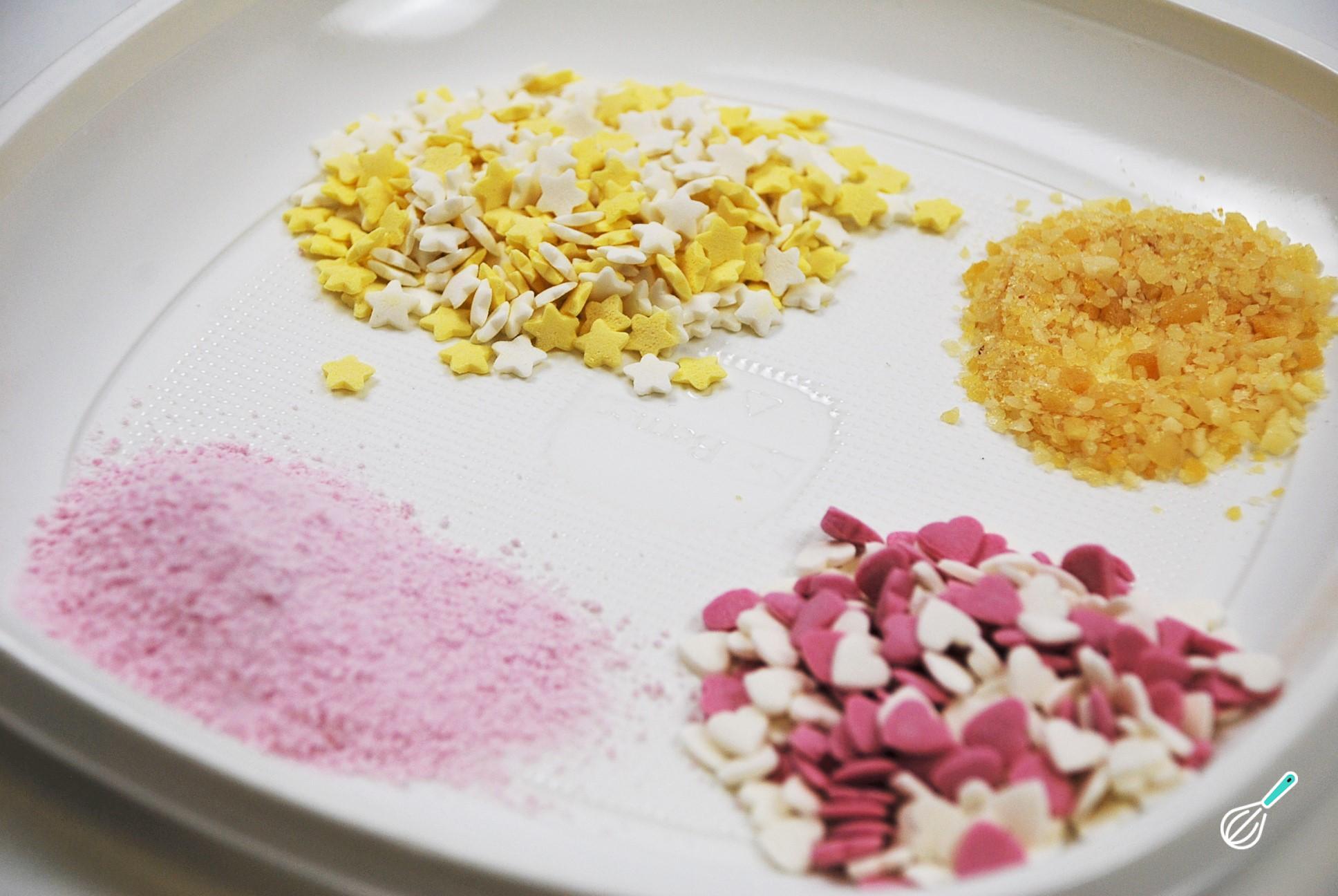À parte, organize os elementos decorativos, que são totalmente ao seu gosto. Além dos confeitos coloridos, também pode usar frutas secas.