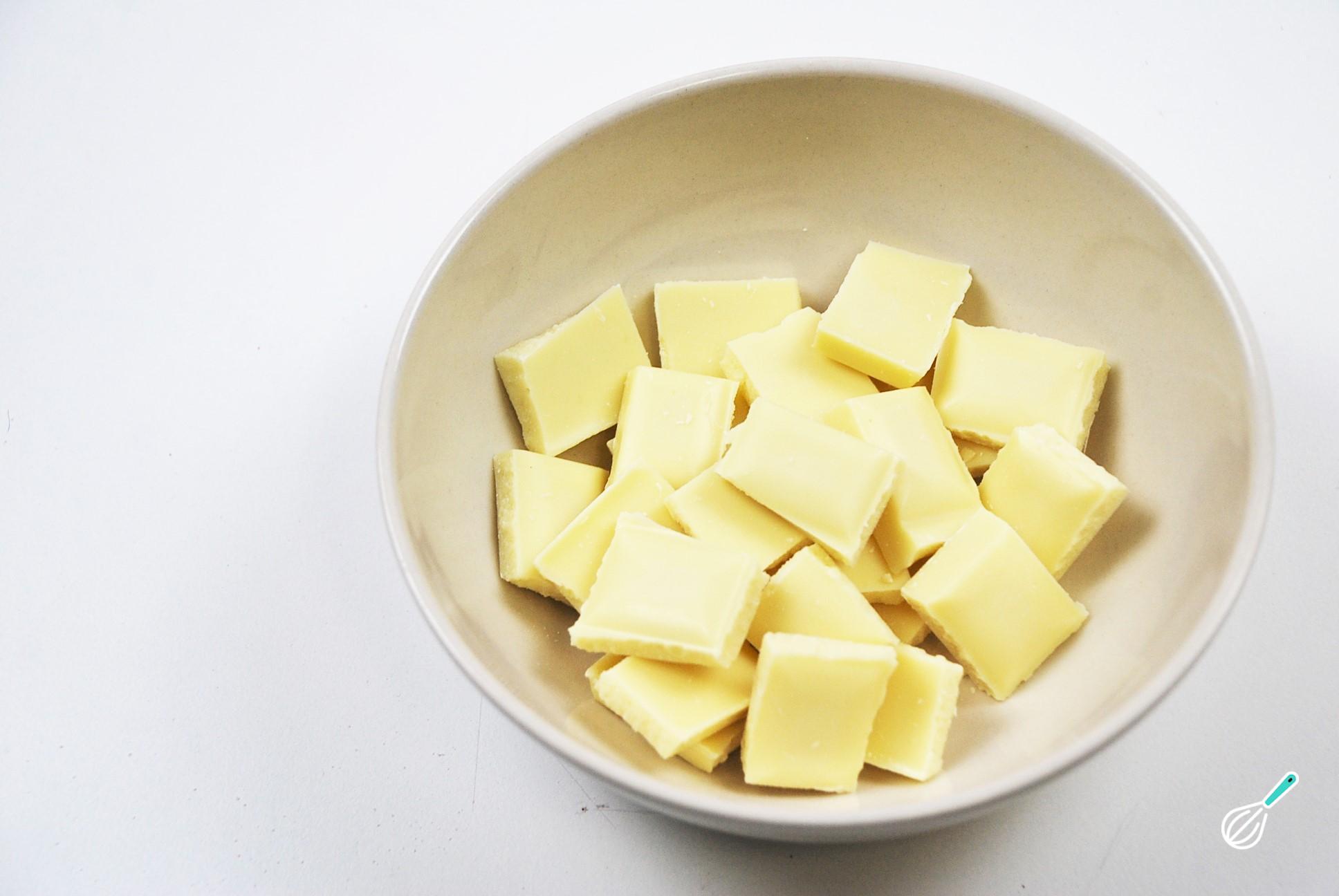 Em seguida, pique o chocolate e derreta. Você pode fazê-lo no microondas, esquentando de 30 em 30 segundos, ou em banho-maria. Neste caso usei chocolate branco, para que não fosse tão visível nos marshmallows.