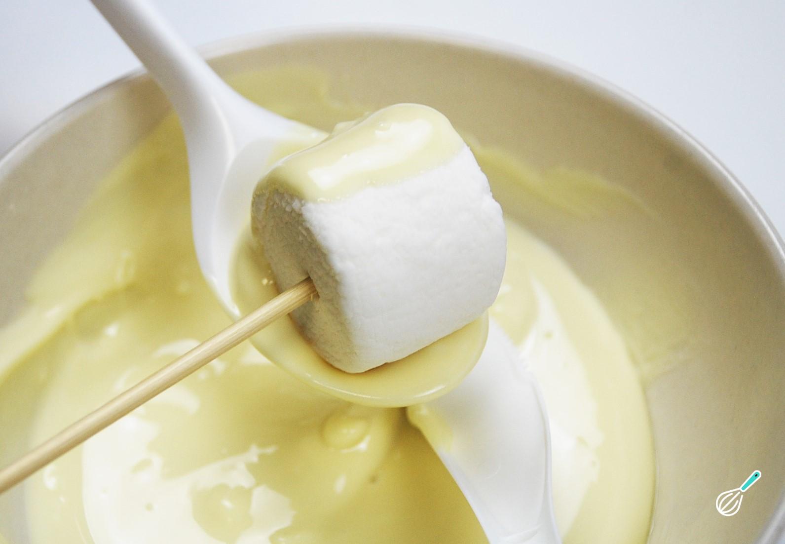 Quando o chocolate já estiver completamente derretido, o próximo passo é envolver os marshmallows nele, totalmente ou apenas nas áreas onde irá espalhar os confeitos.
