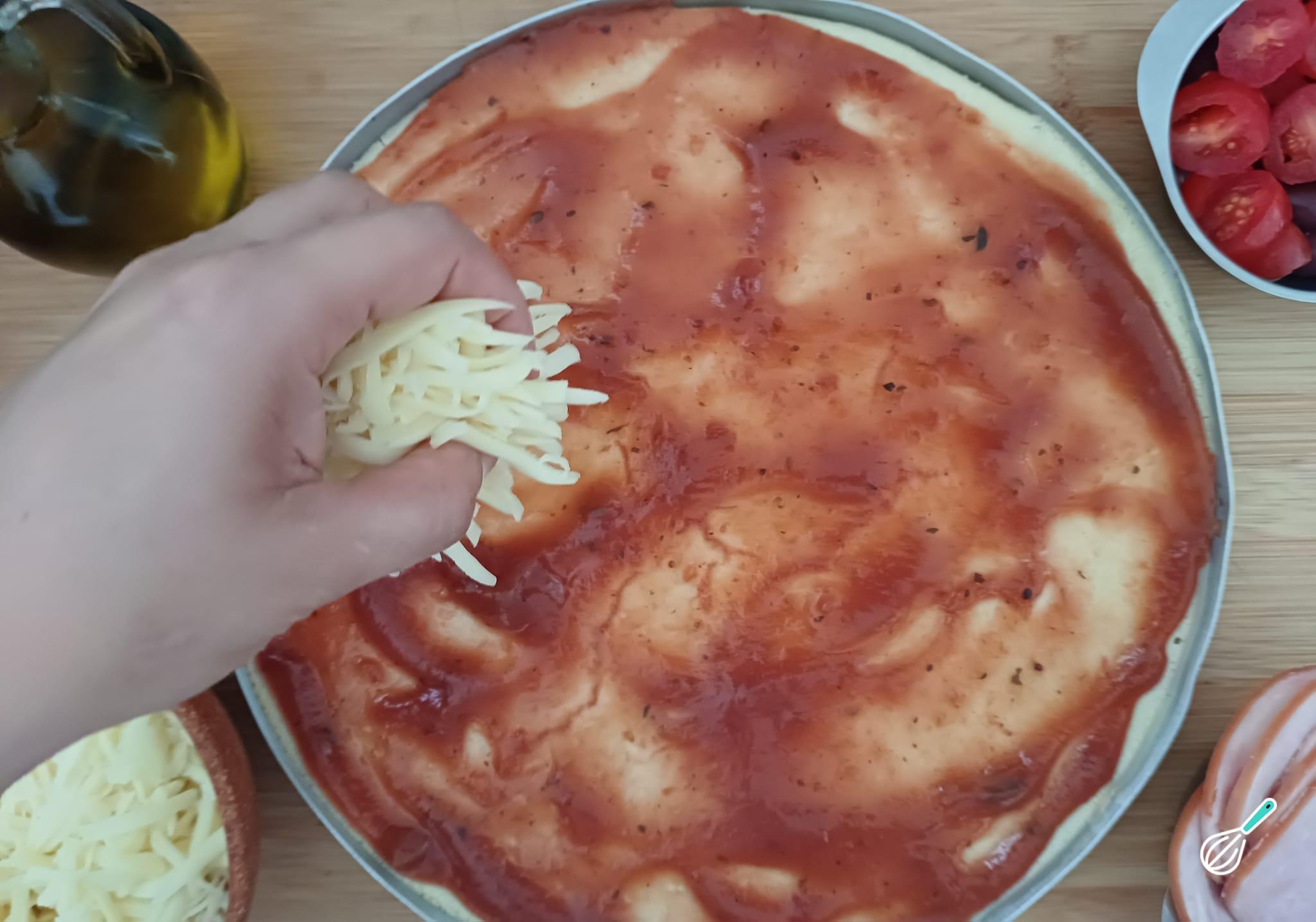Retire a massa do forno e comece a rechear a pizza, primeiro colocando o molho de tomate e depois o queijo muçarela ralado.