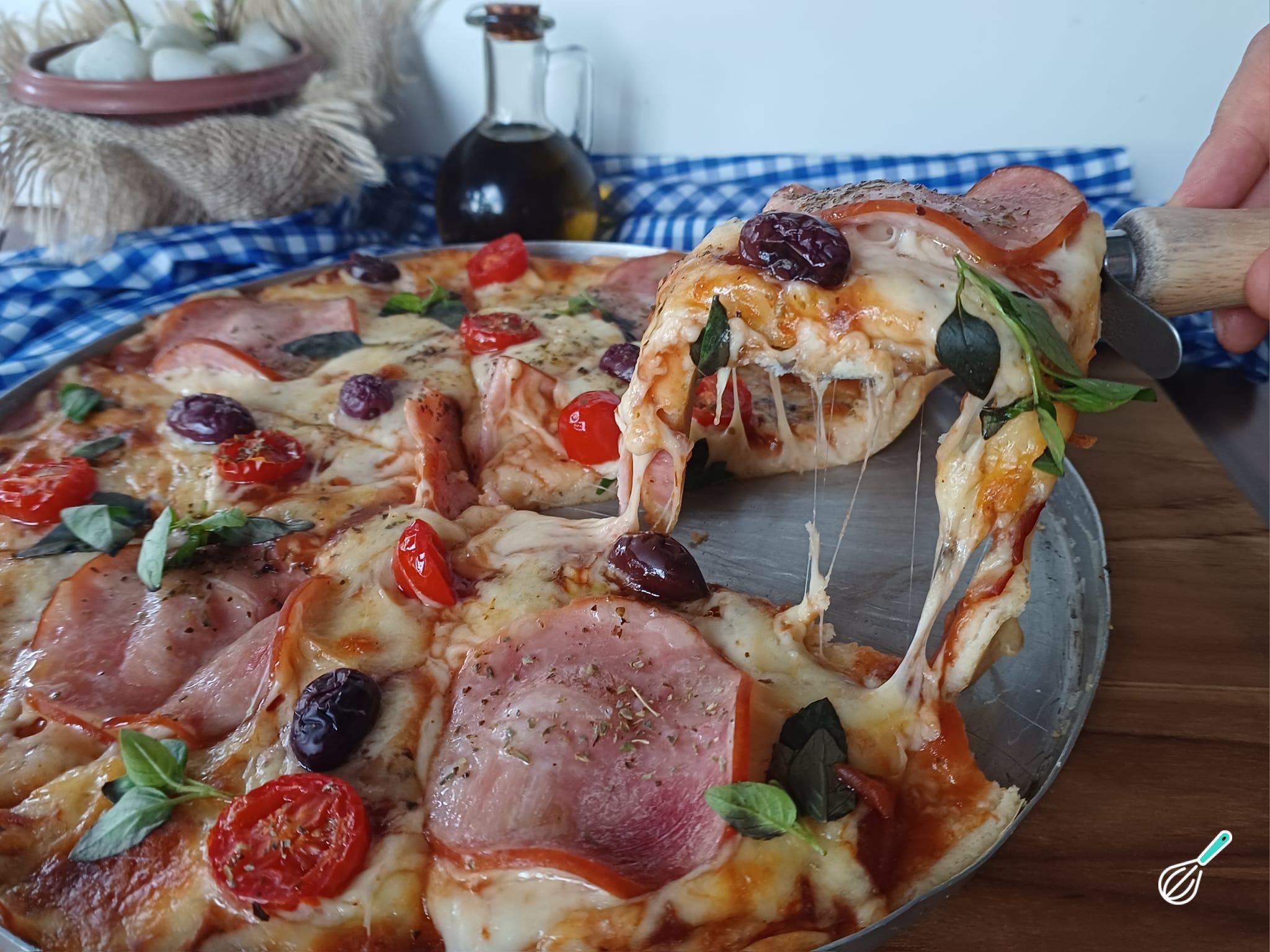 Agora é só retirar do forno e saborear essa deliciosa Pizza caseira de liquidificador bem quentinha!