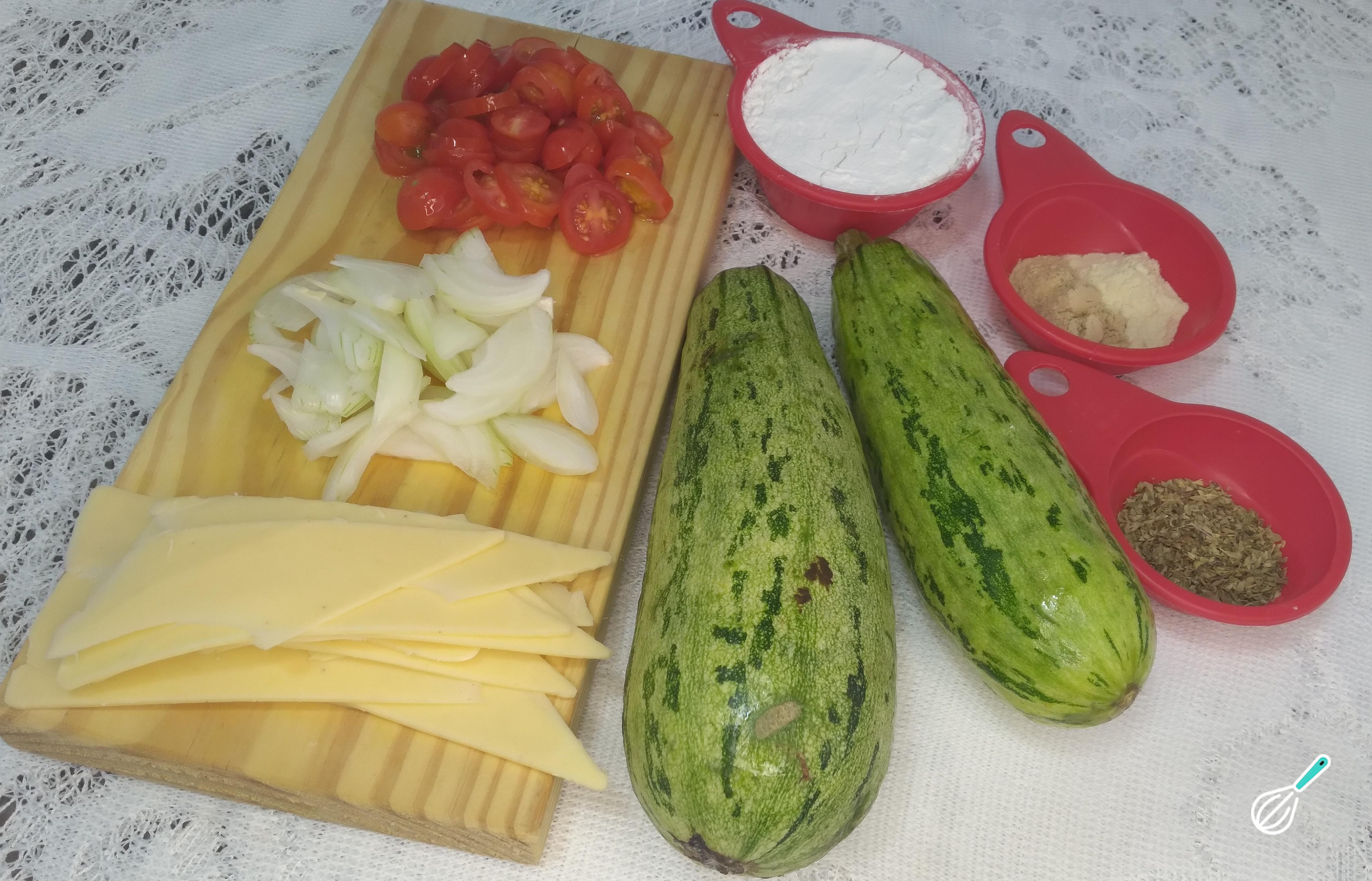 Comece separando os ingredientes que serão usados no preparo da receita. Corte os tomates cerejas em rodelas finas. A cebola branca em formato de meia lua. Separe 2 abobrinhas médias. Separe o queijo parmesão vegano e corte em fatias finas.