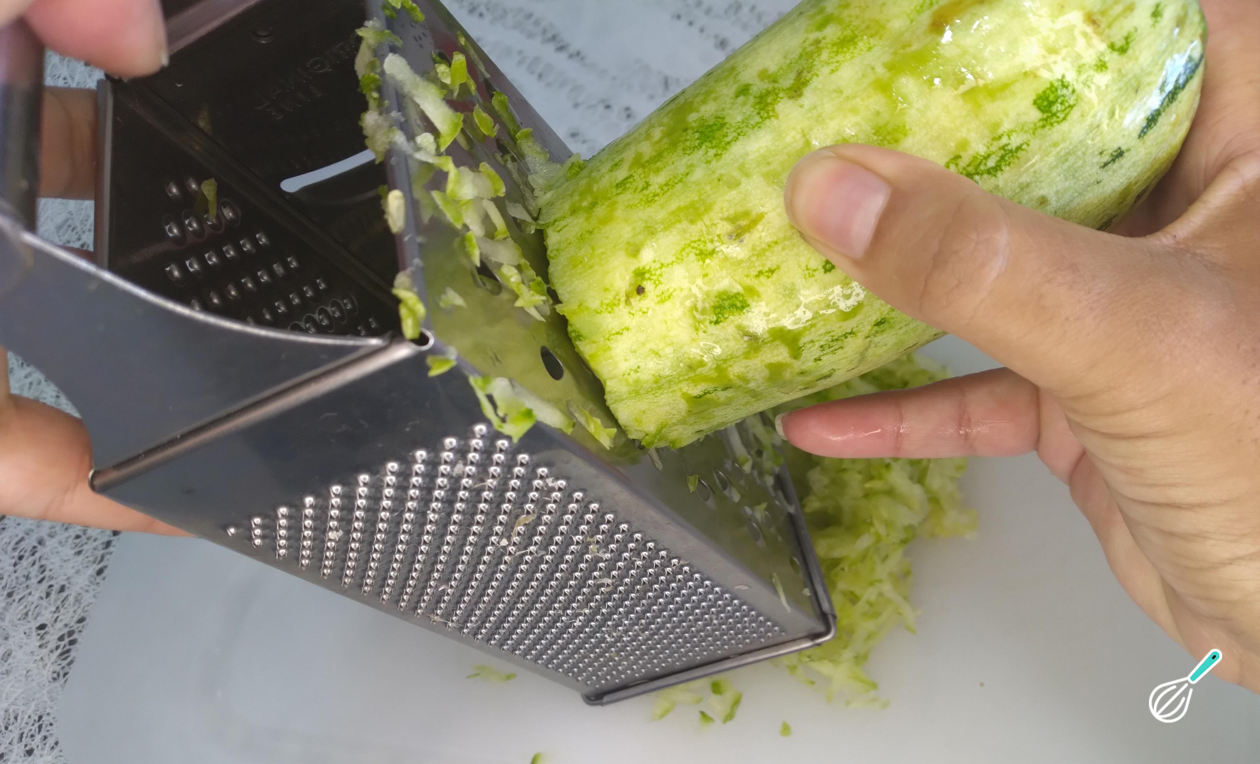 Lave bem as abobrinhas e, usando o lado mais grosso, rale as abobrinhas. Não é necessário retirar a casca.