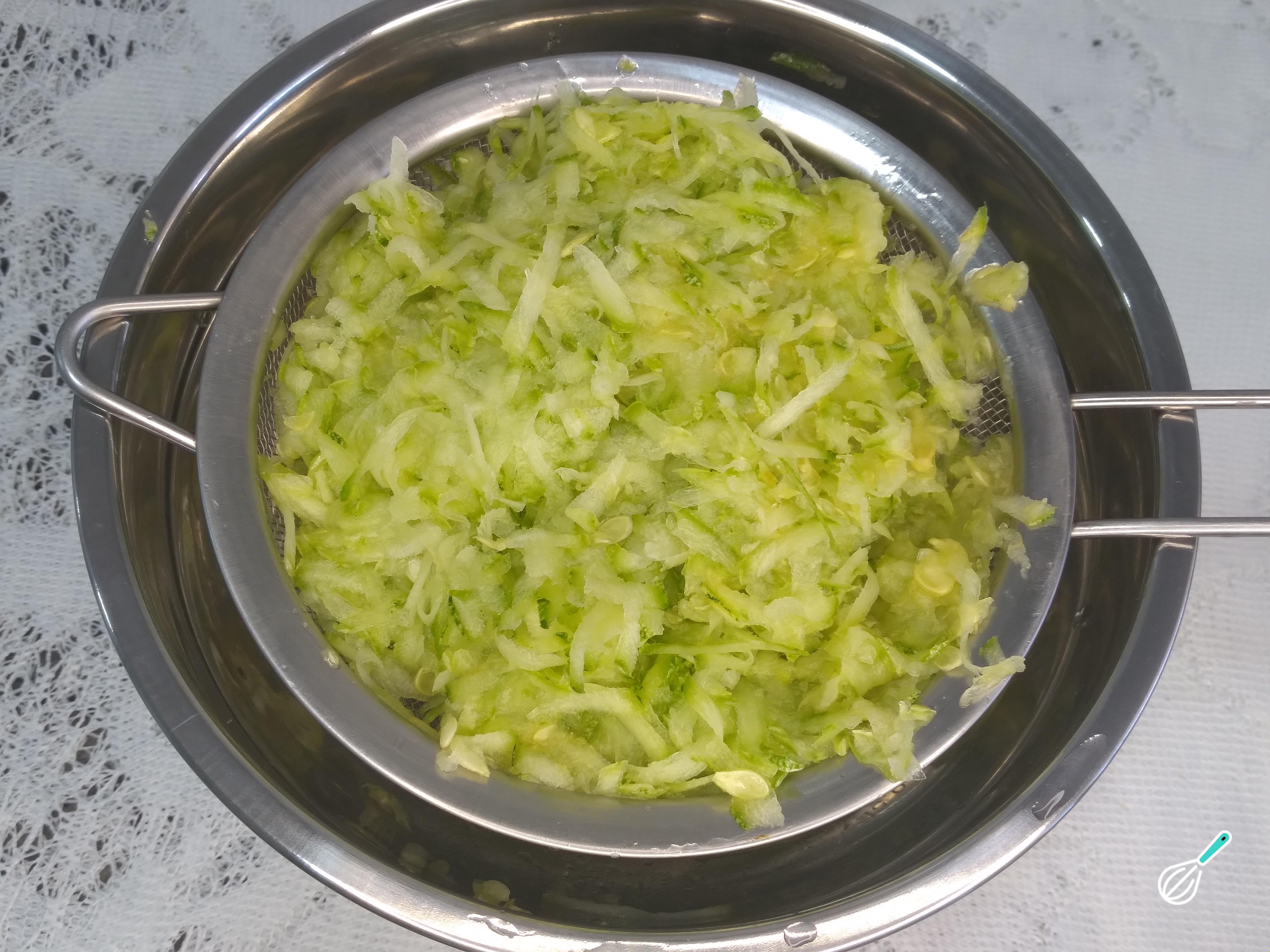 Feito isso, esprema bem a abobrinha para que solte o líquido. A abobrinha é um vegetal que contém muita água. Esse passo é necessário e importante para o sucesso da receita. Usando uma peneira, coloque sal na abobrinha e deixe ela escorrer o líquido, por uns 15 minutos.