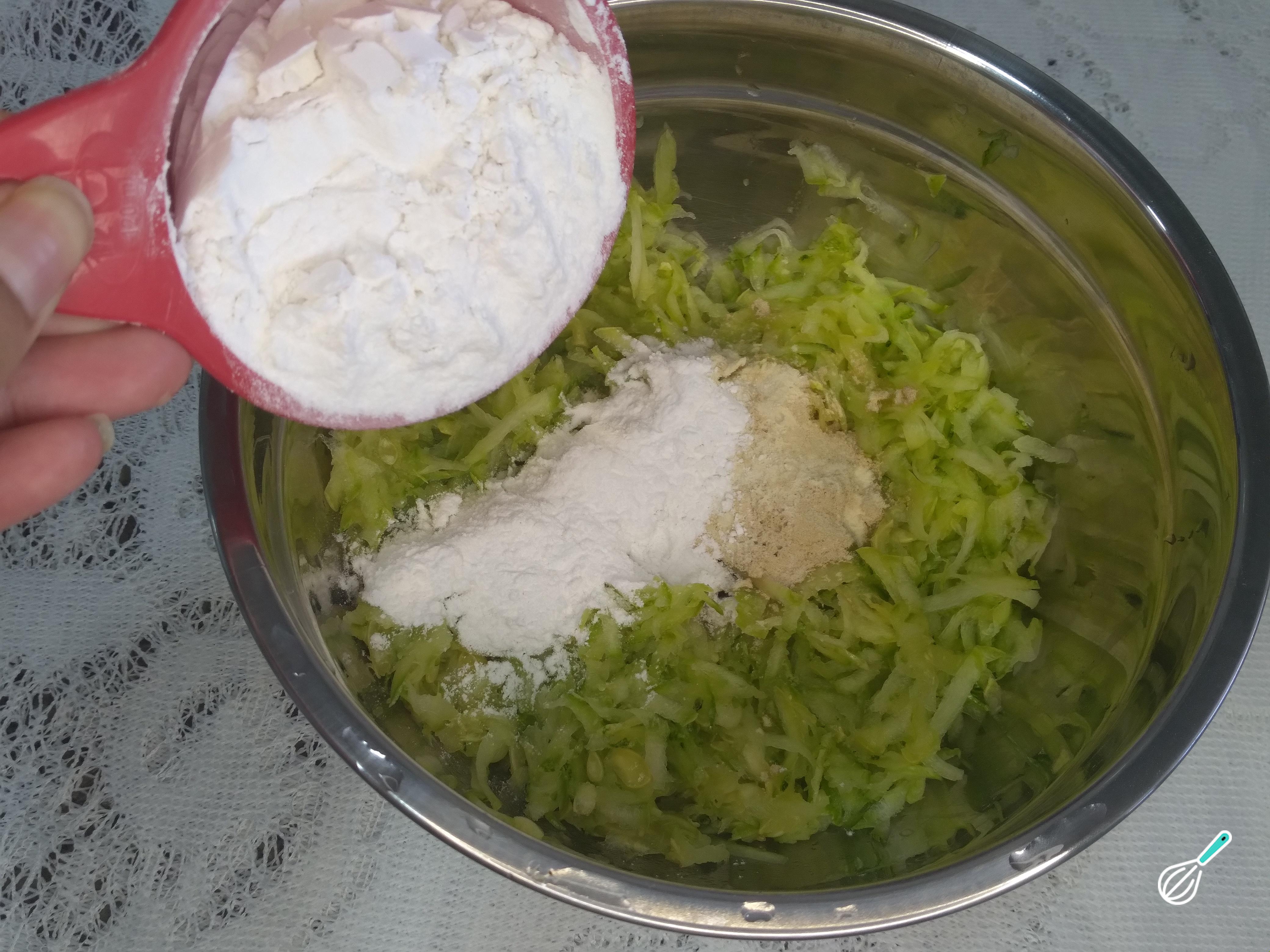 Depois desse tempo, descarte o líquido. Transfira a abobrinha para a tigela e acrescente os temperos de sua preferência, e a farinha de arroz. Misture tudo muito bem até que a massa fique soltando das mãos.
