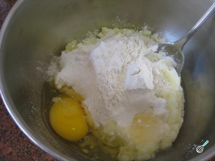 Para fazer esta pizza com massa de batata, comece por misturar todos os ingredientes da massa numa taça funda até obter uma mistura suave e homogênea. Para fazer o purê pode seguir esta receita de purê de batata.