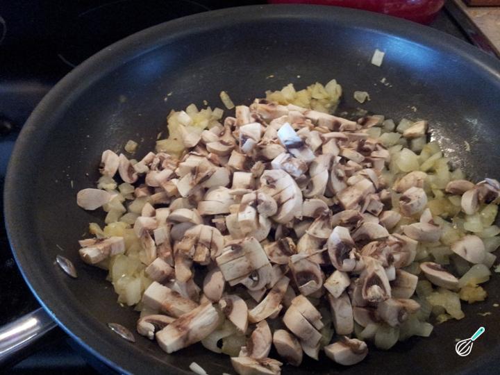 Enquanto a massa assa, pique os ingredientes do recheio e refogue por 15 minutos em azeite, misturando tudo bem. Coloque esse recheio sobre a massa, polvilhe queijo mussarela a gosto e leve novamente ao forno para cozinhar por 15 minutos a 180-190 ºC.