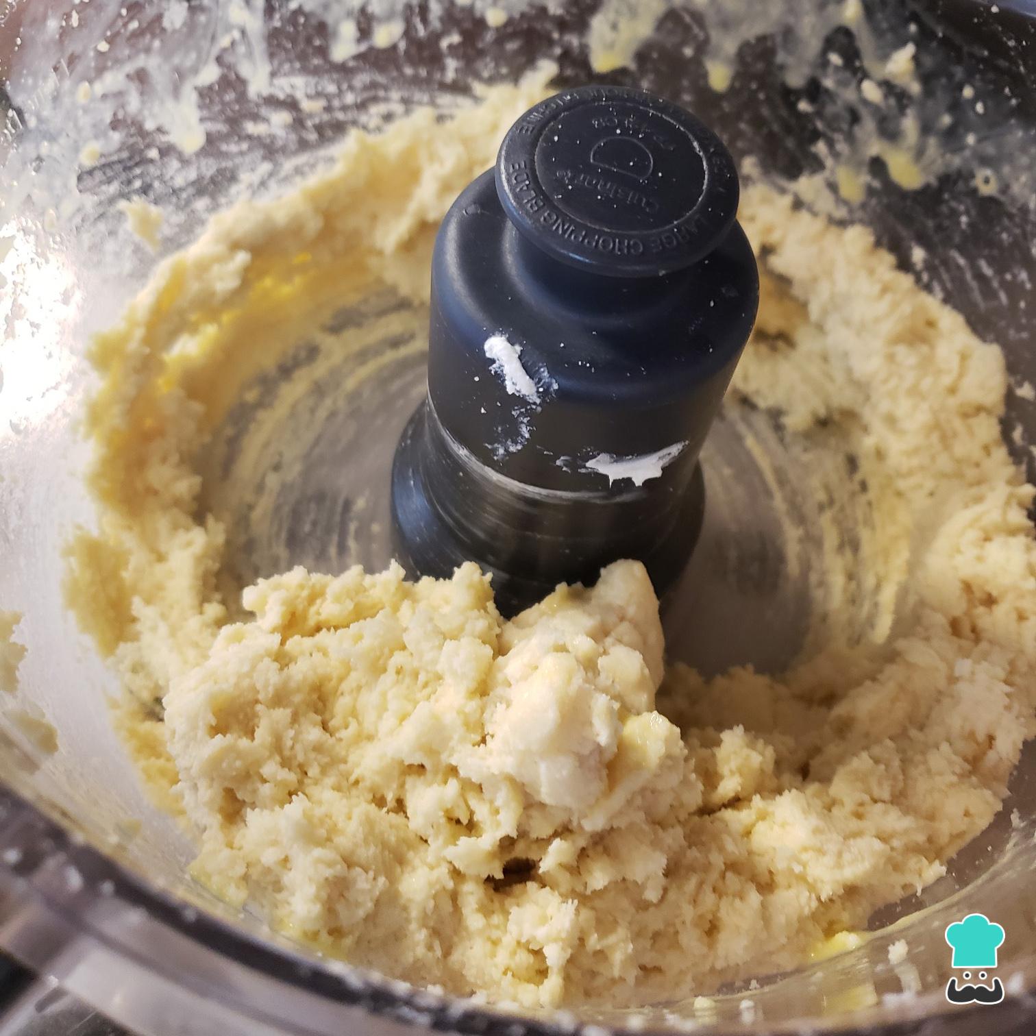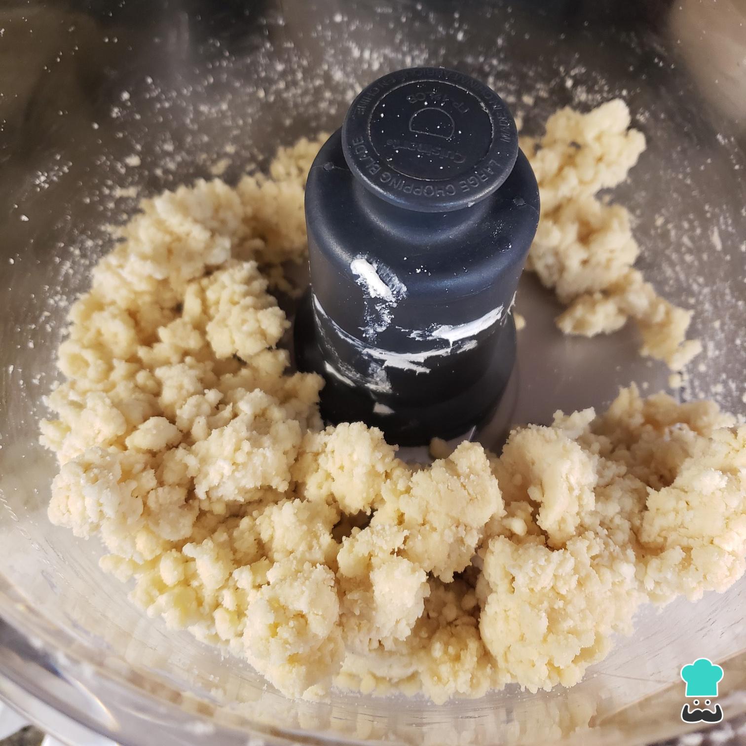 Coloque o vinagre com o processador funcionando e, quando estiver bem misturado, coloque o ovo com ele ligado. Vá adicionando a água até formar uma bola de massa grudenta mas firme.