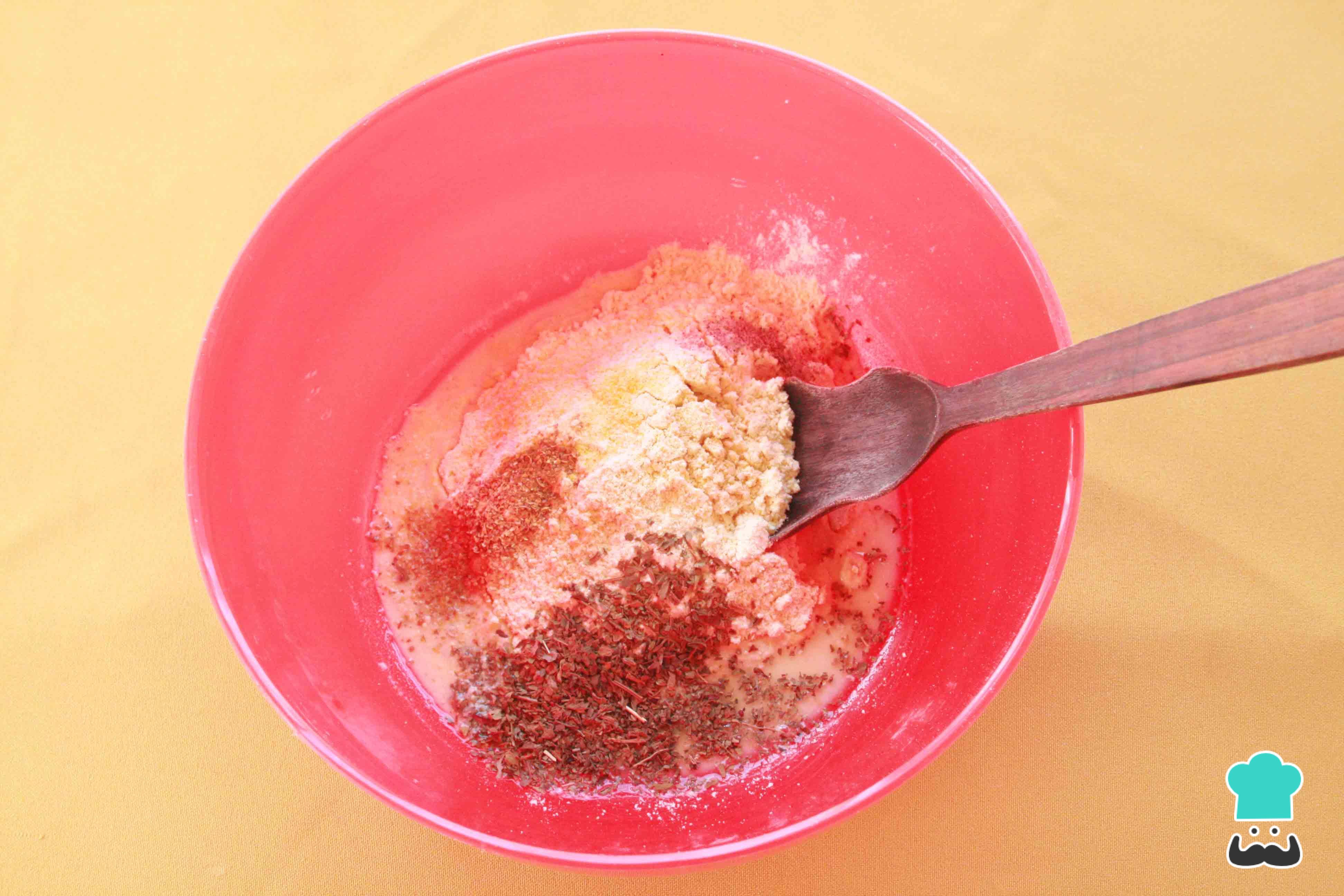 Coloque numa tigela os ingredientes secos da massa: a farinha de grão de bico, o alho em pó, a cebola em pó, a cebolinha, o manjericão e a salsinha secos.