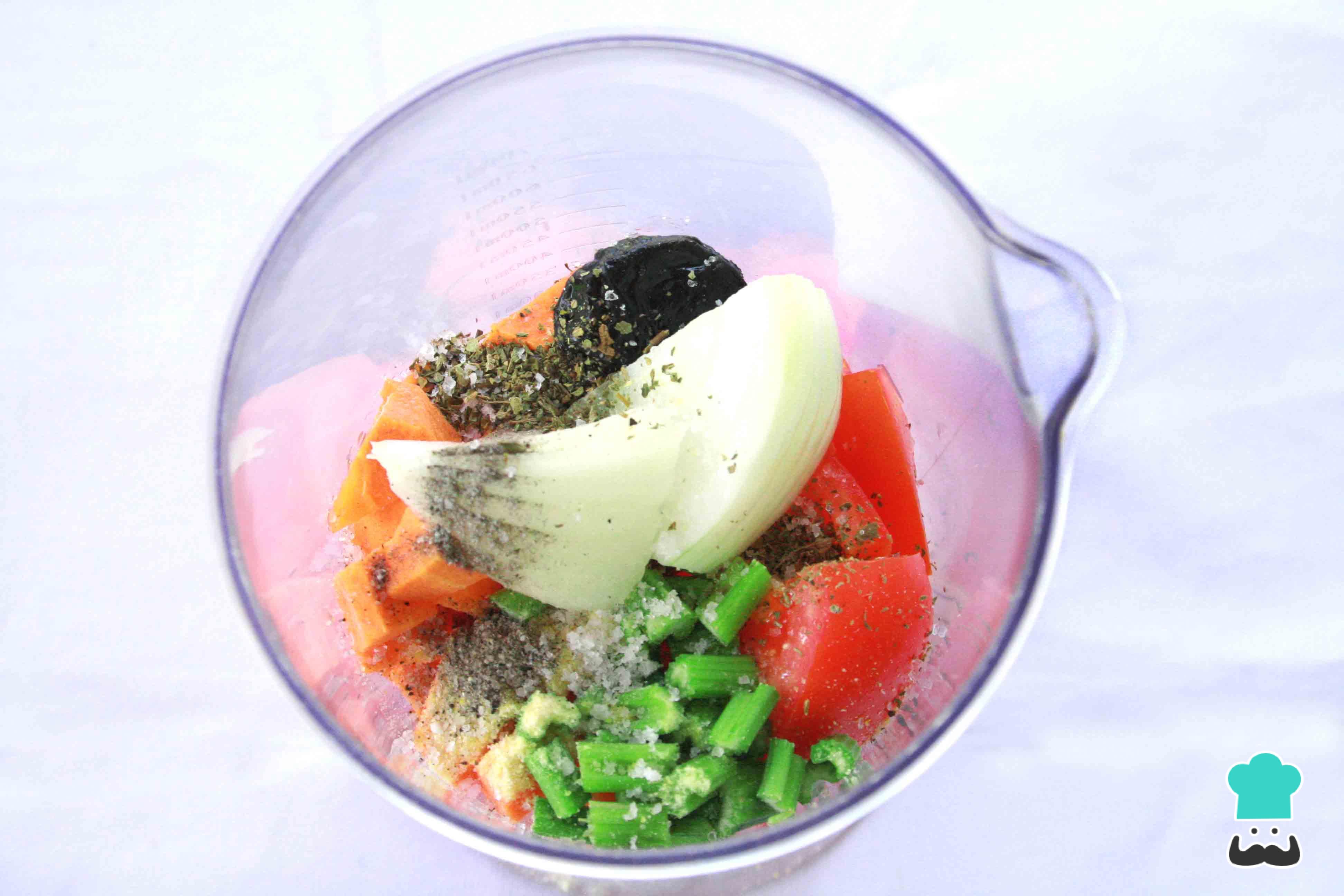 Agora prepare o molho de pizza vegano: bata no liquidificador os tomates, o aipo, a cebola, a cenoura, os alhos, a ameixa sem caroço, os oréganos, sal e pimenta a gosto até conseguir um molho liso. Se estiver muito espesso adicione um pouco de água.