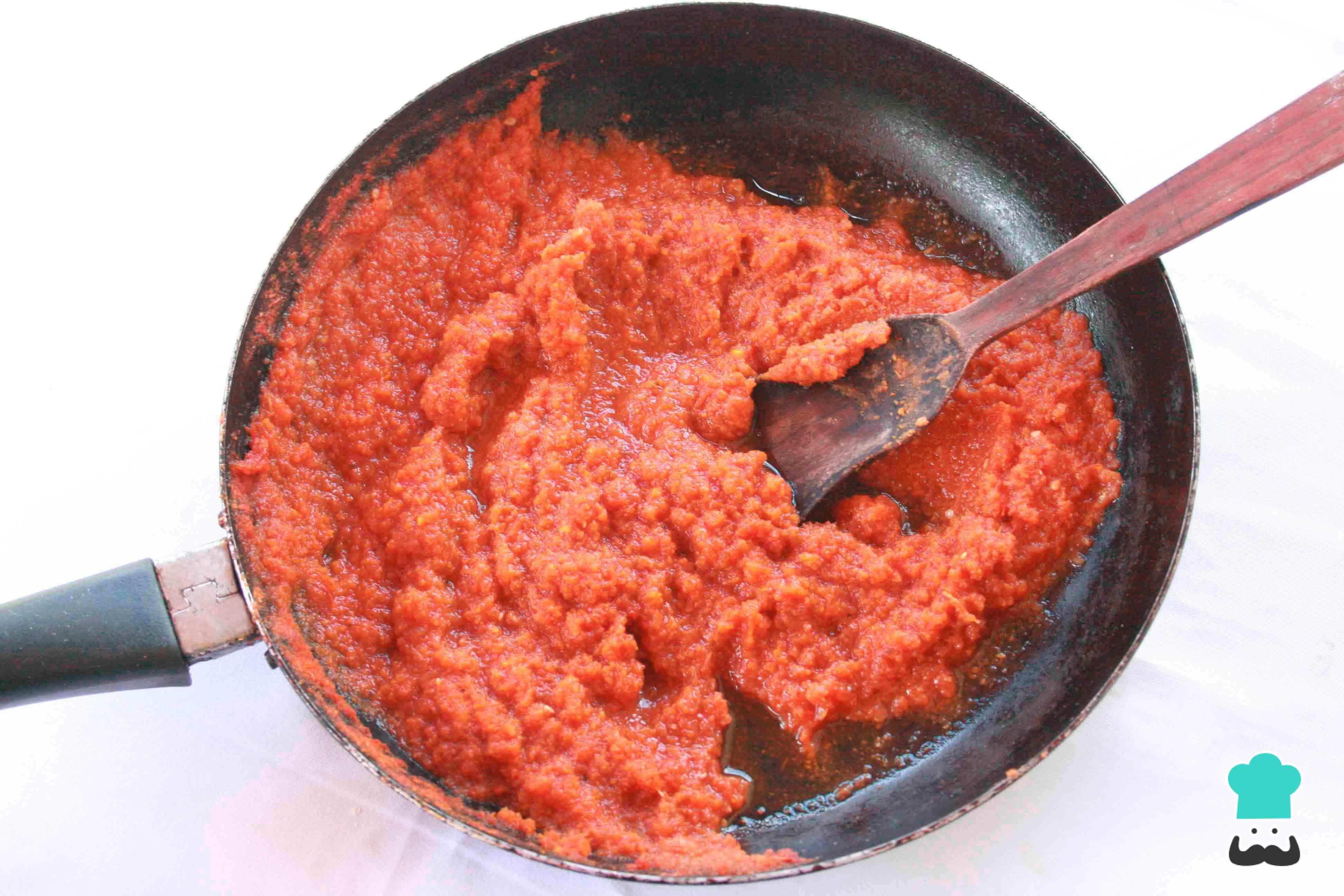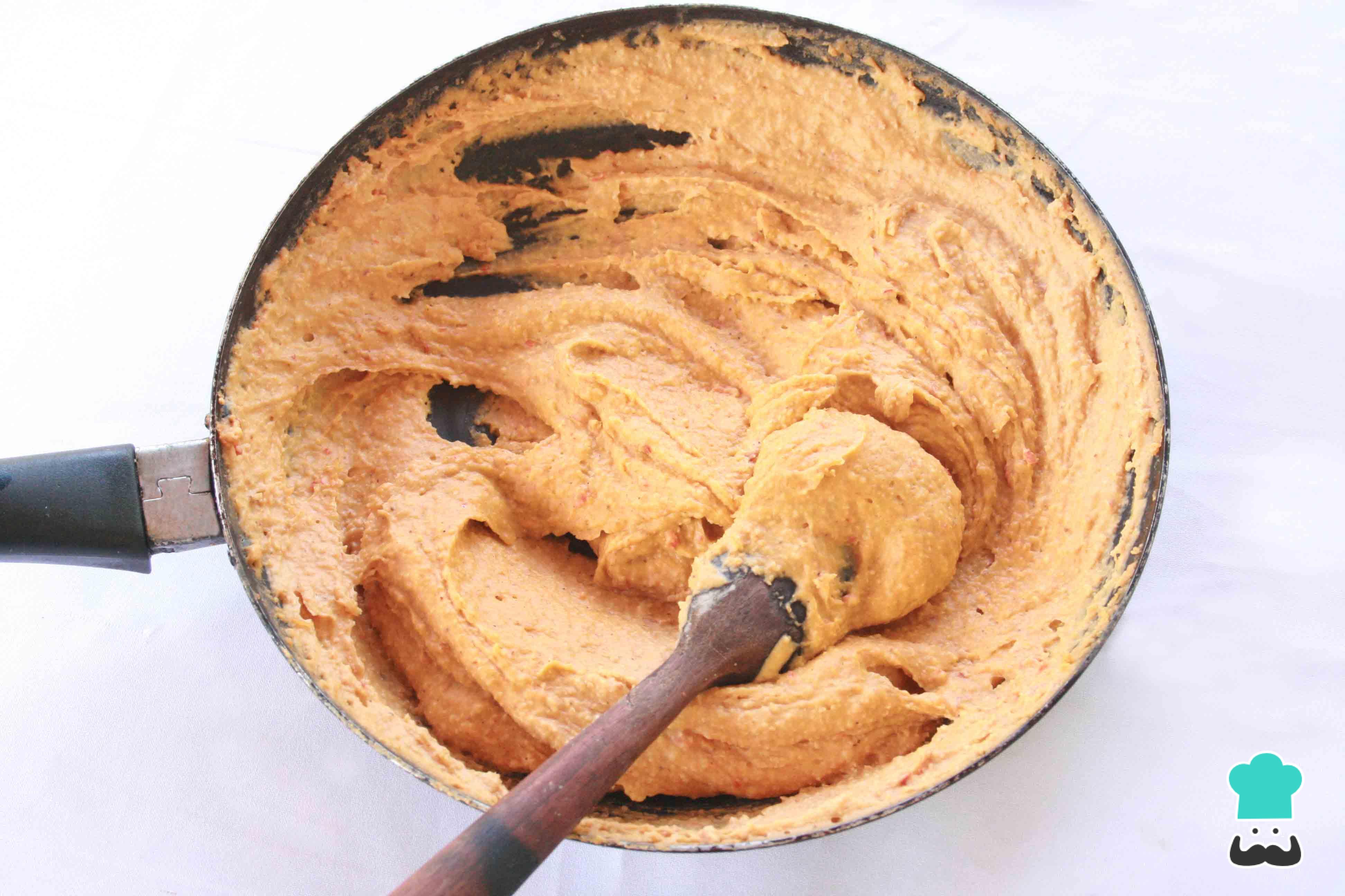 Coloque a mistura anterior numa frigideira e leve ao fogo mexendo sempre até ficar espessa, como polpa de tomate. Desligue e reserve.
