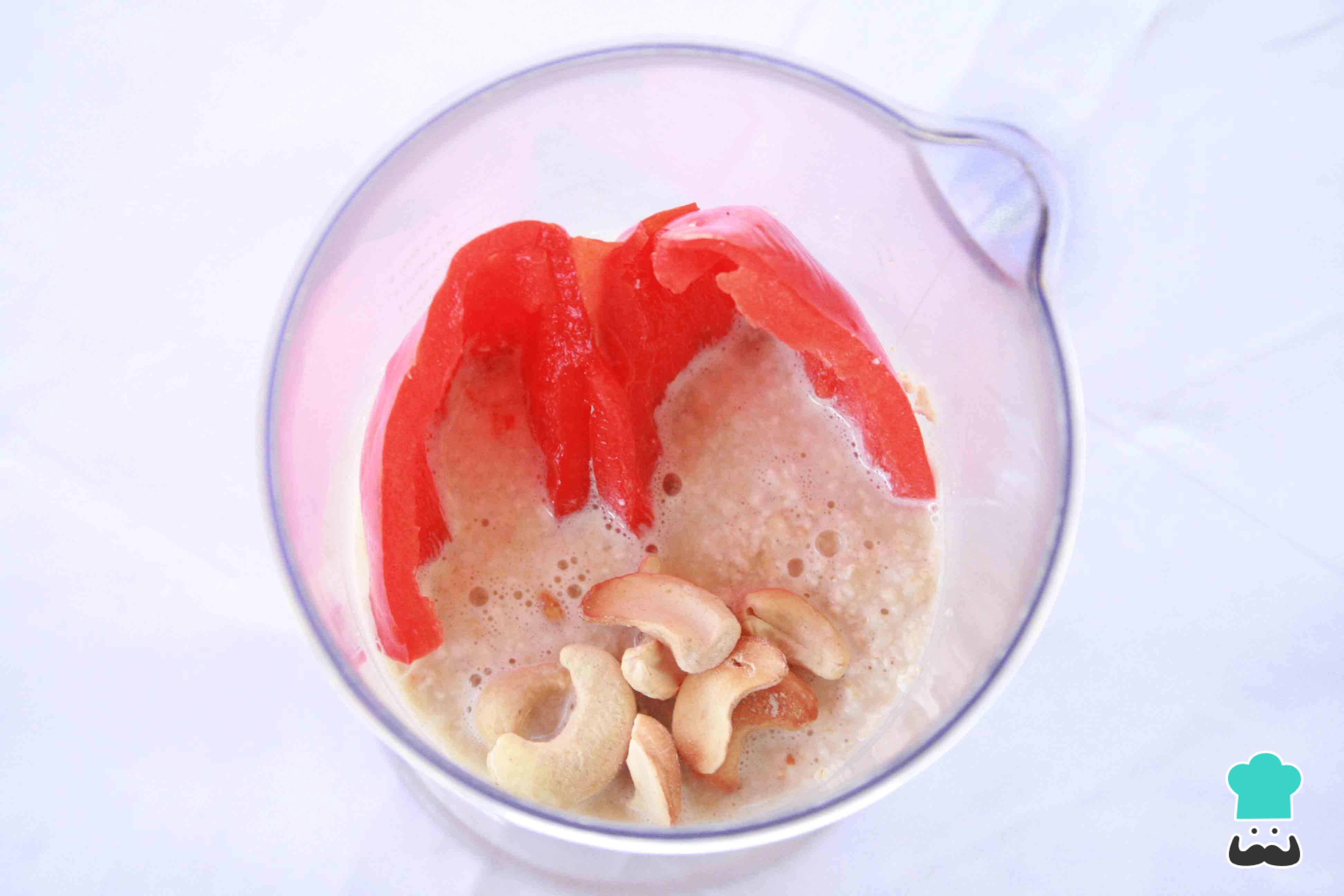 Seguidamente prepare o queijo vegano de aveia batendo também no liquidificador a aveia com os cajus, o suco de limão, o pimentão, a levedura nutricional e sal a gosto. O resultado deverá ser uma pasta sem grumos. Reserve.