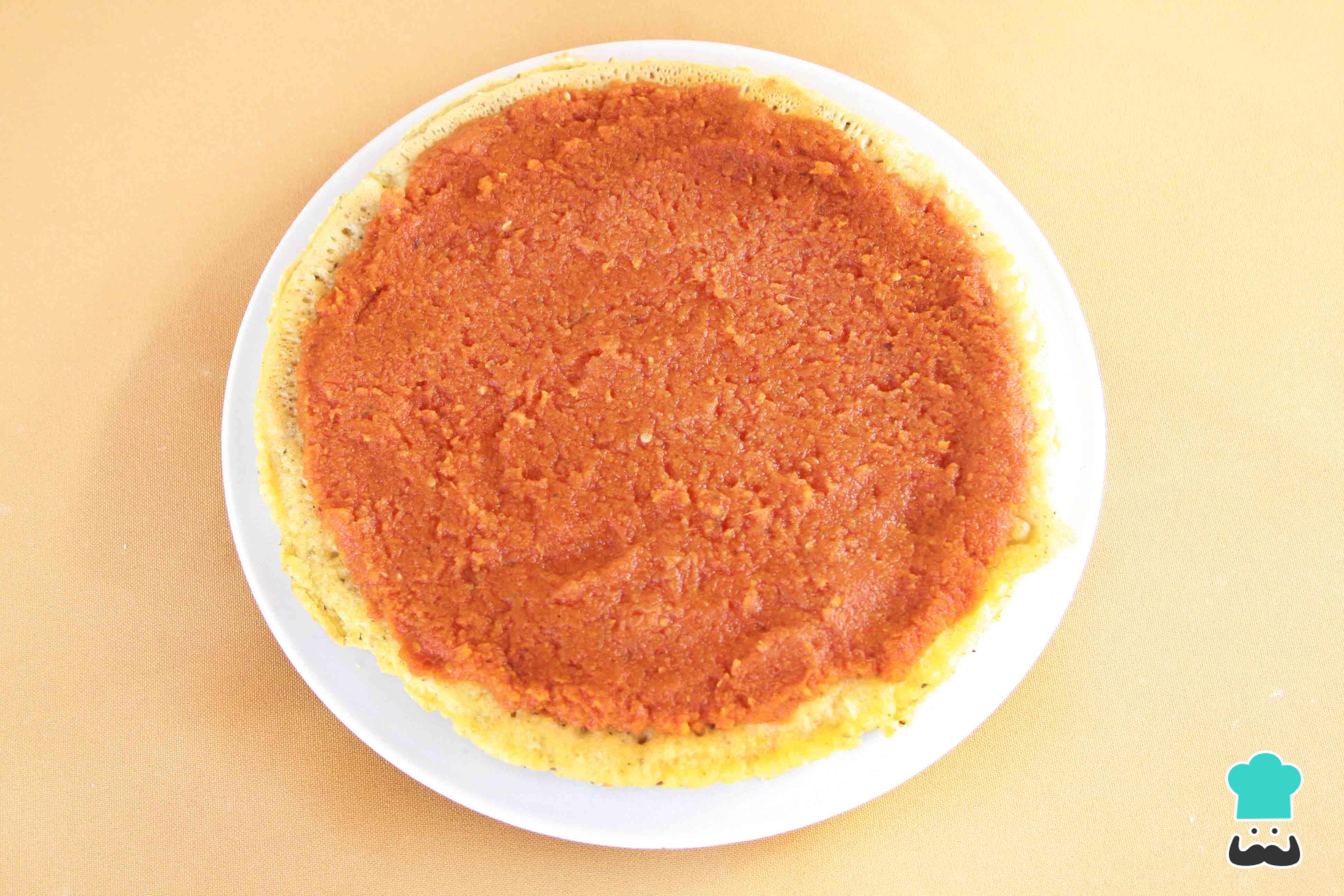 Quando a massa estiver consistente e dourada dos dois lados coloque num prato para começar montando esta pizza de frigideira fit.