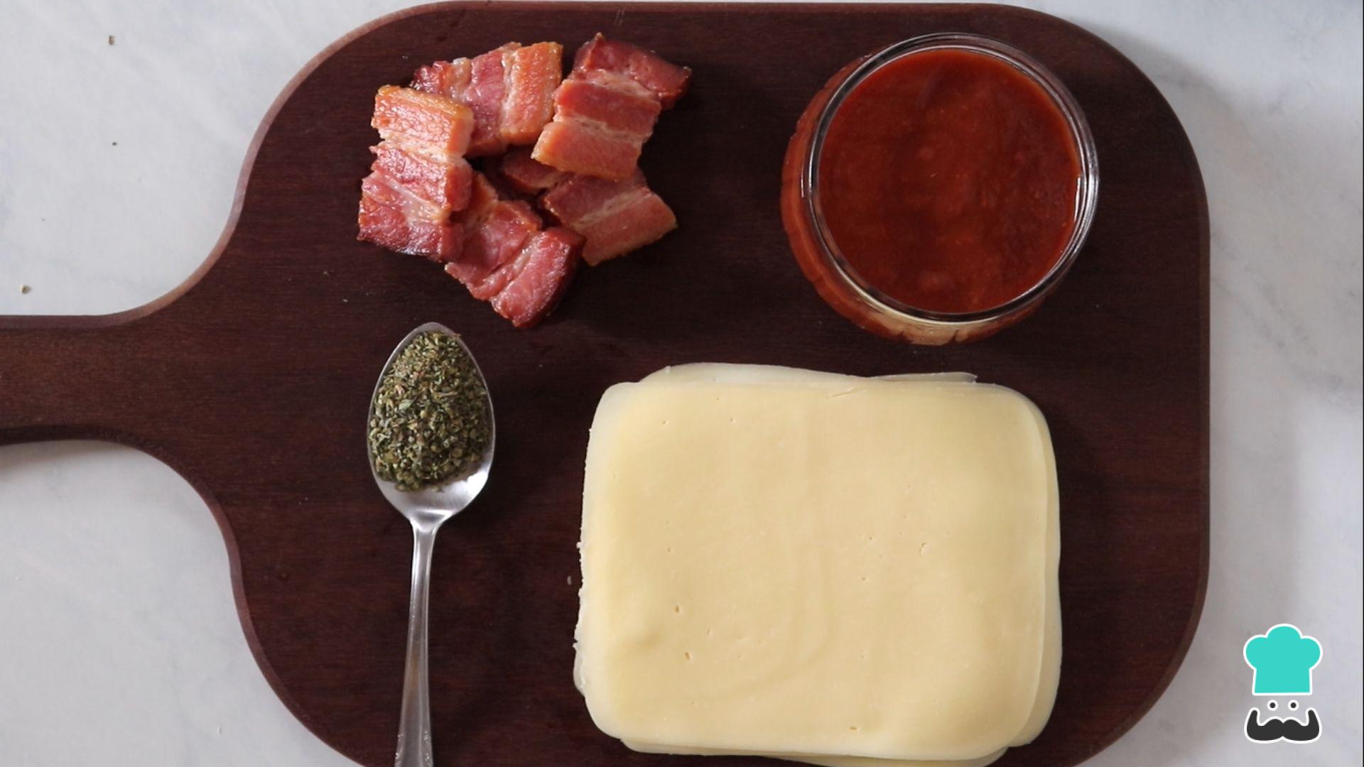 Enquanto isso, separe os ingredientes da cobertura da sua pizza de liquidificador. Aqui nós optamos por muçarela + bacon e orégano e, claro, o molho de tomate. Se você quiser usar essa cobertura na sua pizza também, frite o bacon e corte no tamanho que desejar.