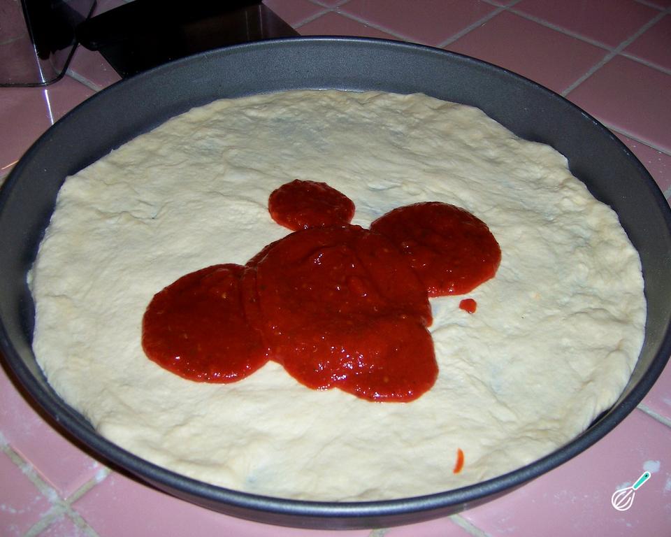 Retire do forno a massa desta receita de pizza de liquidificador simples e fácil e espalhe o molho de tomate por toda ela. Acrescente o queijo, o alho, o requeijão cremoso e salpique a batata palha por toda pizza. Decore com azeitonas.