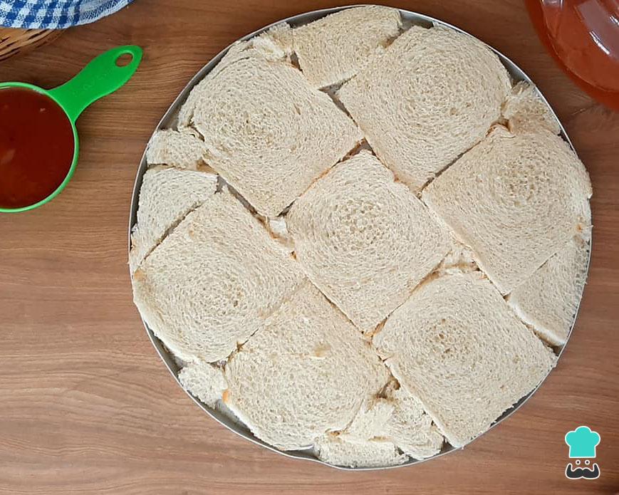Com a forma untada, distribua as fatias de pão cobrindo todos os espaços - para isso será necessário cortar algumas fatias em pedaços menores.