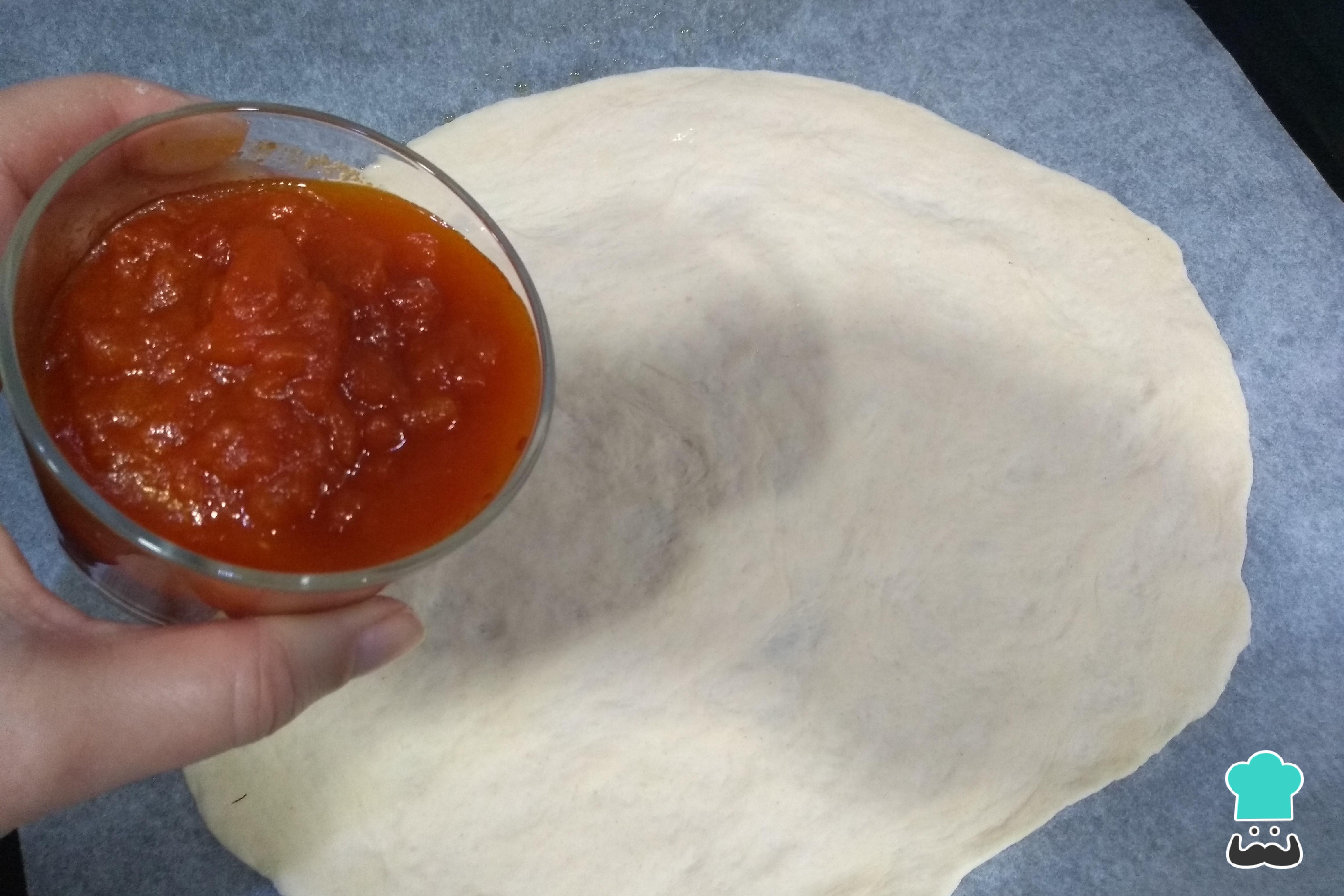 Pegue a massa de pizza e separe em duas metades iguais. Abra uma dessas porções em uma folha de papel manteiga, com a ajuda de um rolo, até conseguir um disco de massa com menos de 5 mm de altura. Coloque uma porção do molho de tomate e espalhe com uma colher.